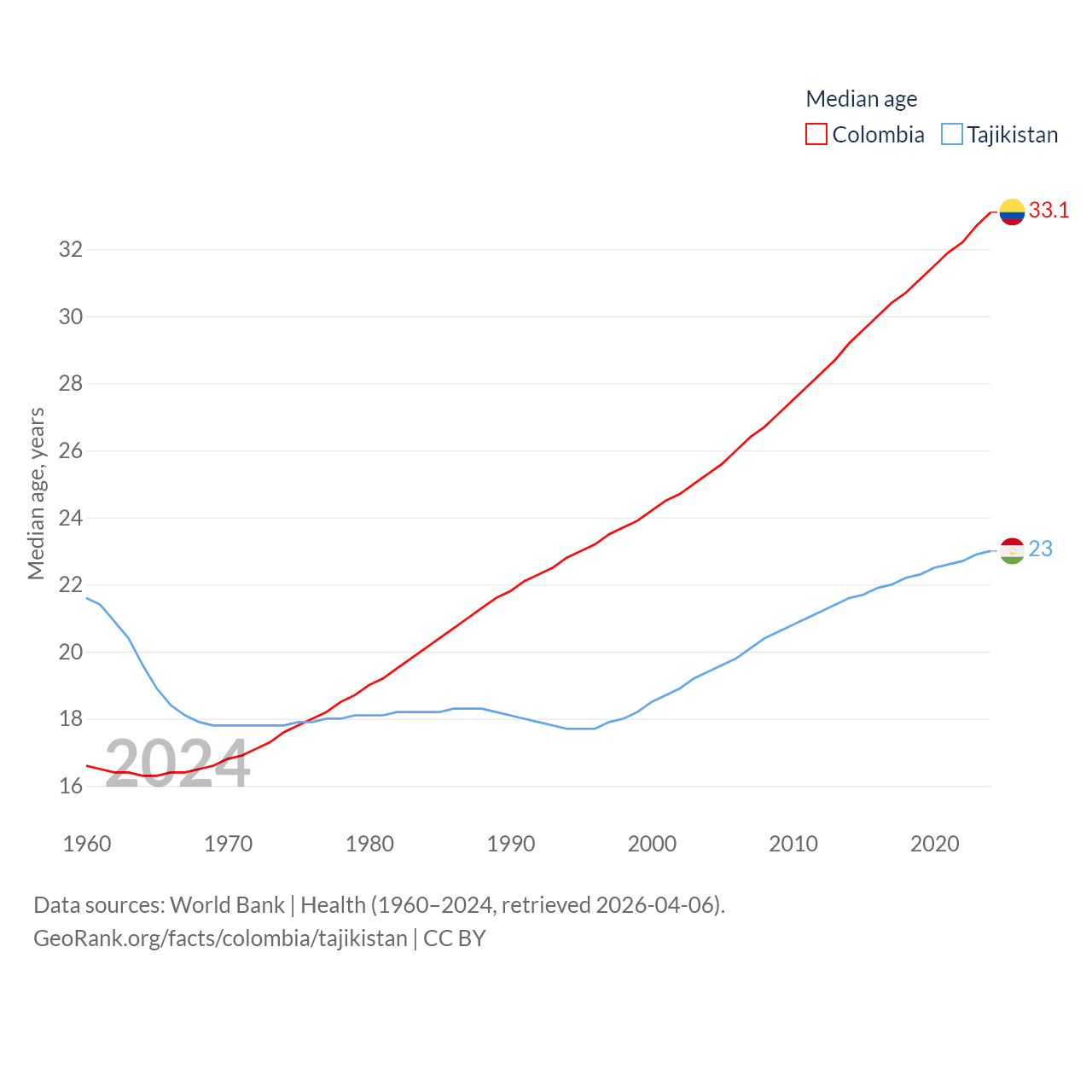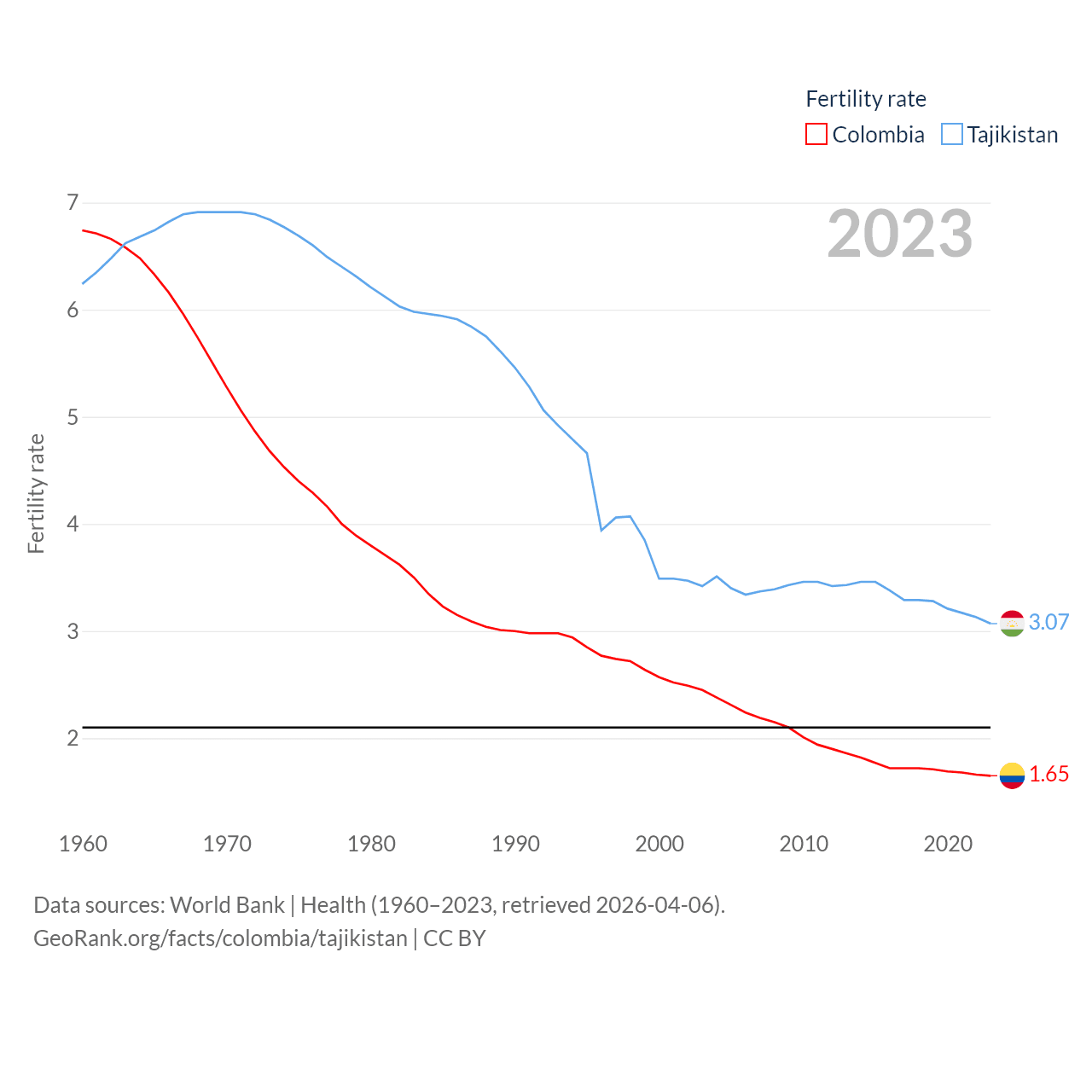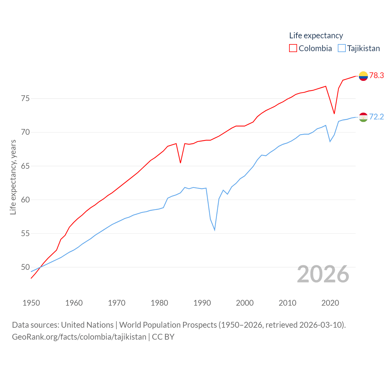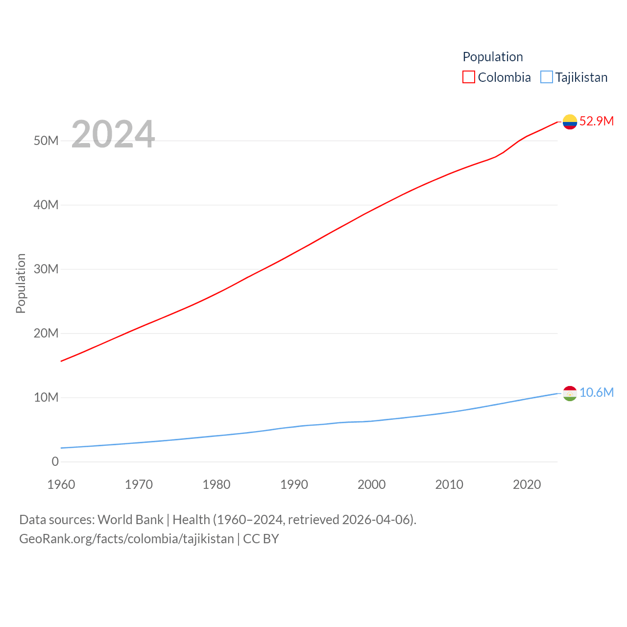 Colombia has a population of 52.9M (ranked 28/197), compared with 10.6M in Tajikistan (ranked 91/197). Colombia's land area is 428,380 sq mi versus 53,587 sq mi for Tajikistan (ranked 26th vs. 93rd).