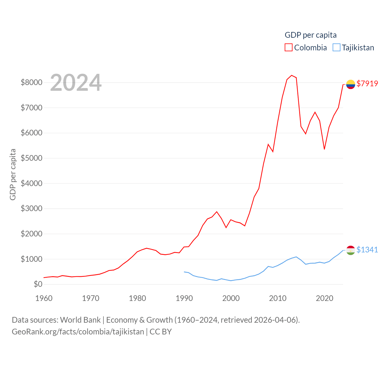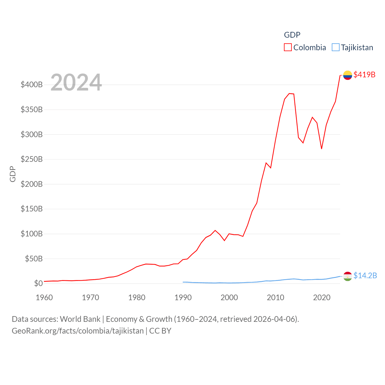 By GDP, Colombia ranks 39/197 ($419B) and Tajikistan ranks 145/197 ($14.2B). By GDP per capita, Colombia ranks 94/197 ($7,919), while Tajikistan ranks 166/197 ($1,341).