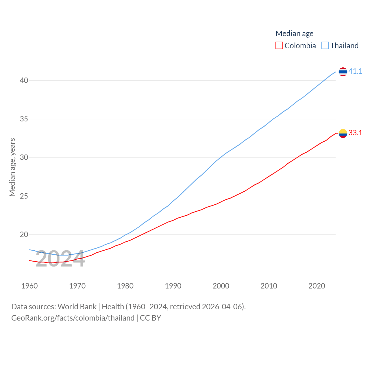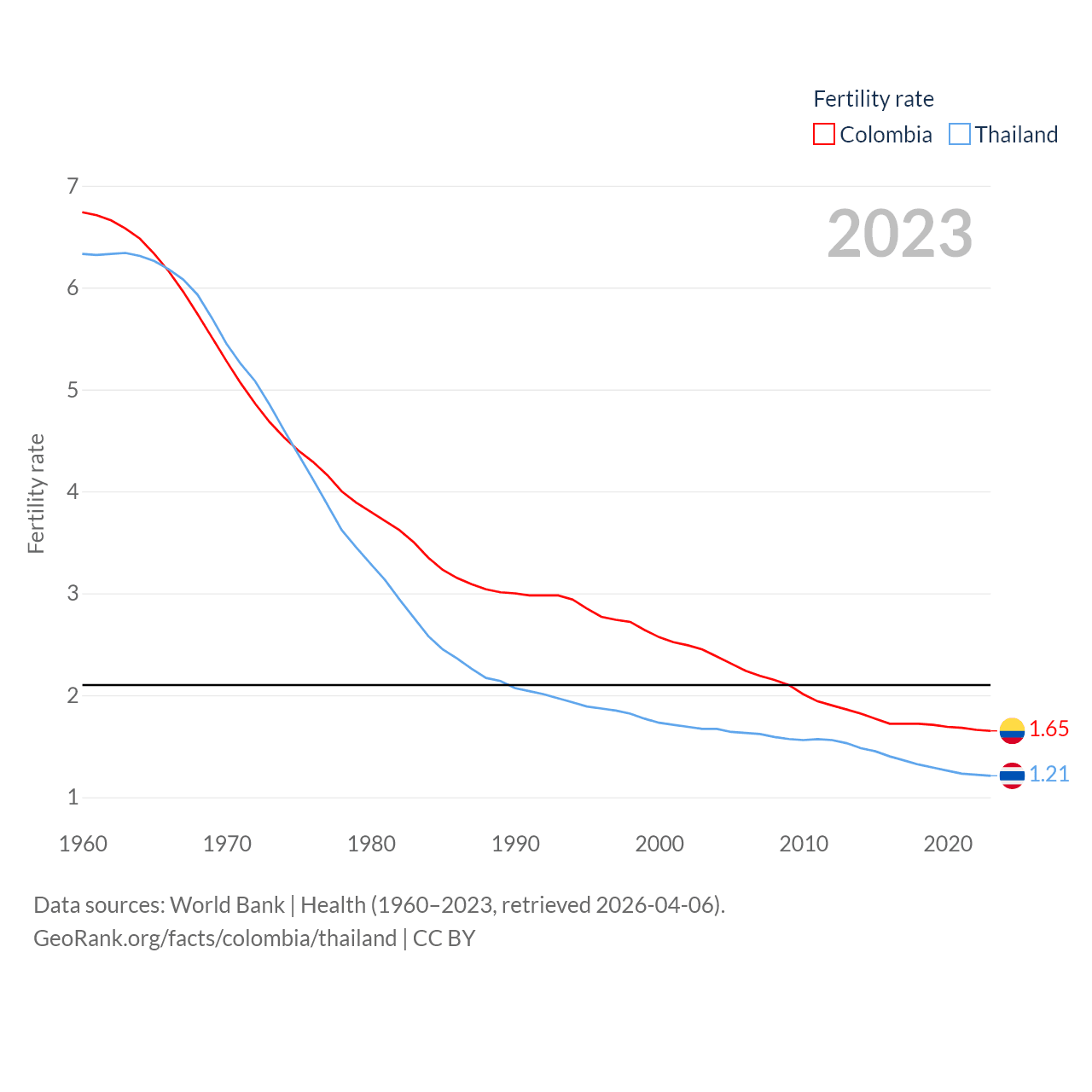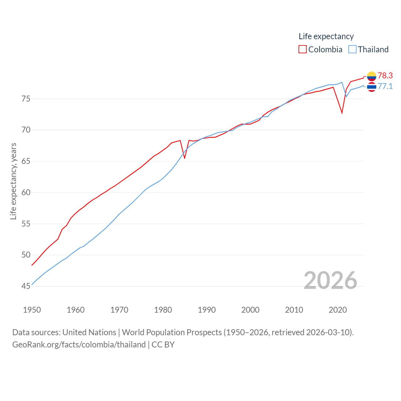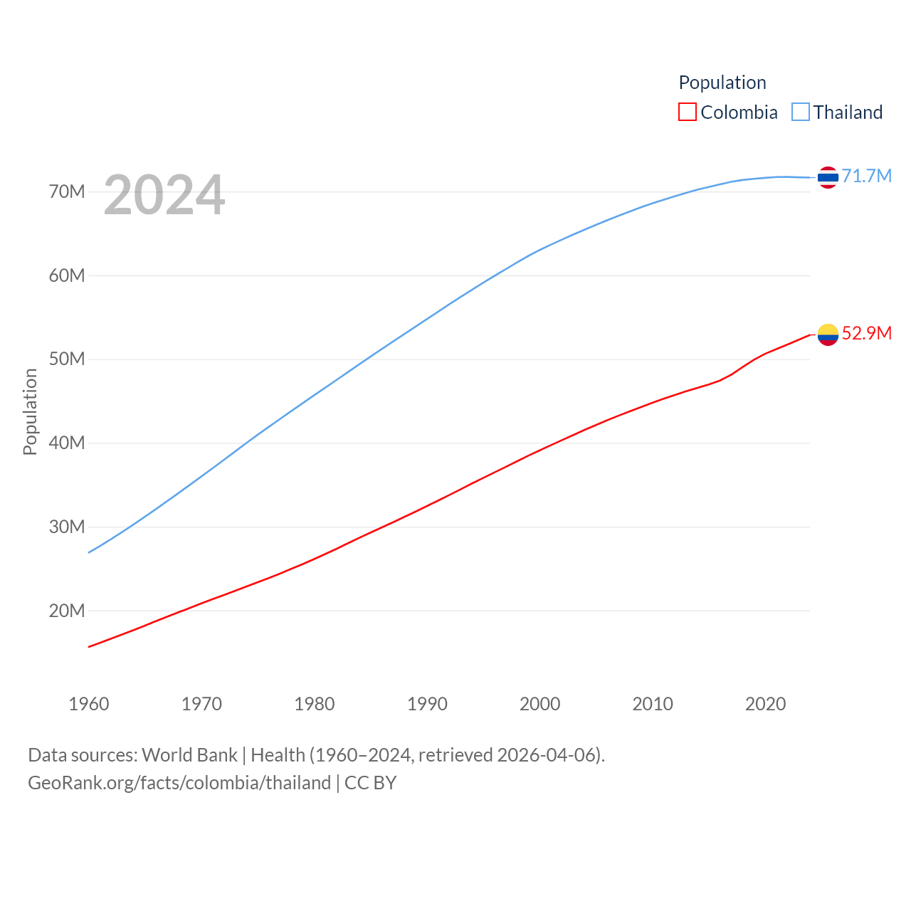 Colombia has a population of 52.9M (ranked 28/197), compared with 71.7M in Thailand (ranked 20/197). Colombia's land area is 428,380 sq mi versus 197,256 sq mi for Thailand (ranked 26th vs. 50th).