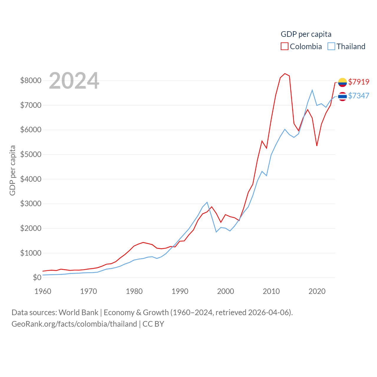 By GDP, Colombia ranks 39/197 ($419B) and Thailand ranks 31/197 ($527B). By GDP per capita, Colombia ranks 94/197 ($7,919), while Thailand ranks 100/197 ($7,347).