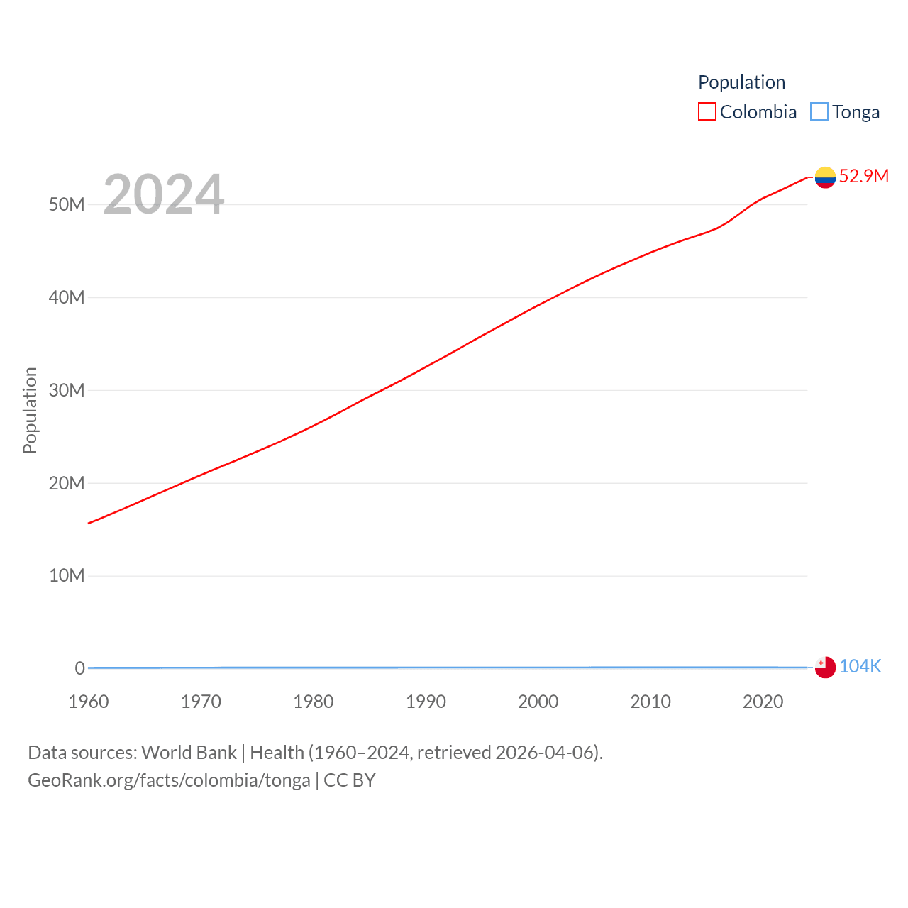 Colombia has a population of 52.9M (ranked 28/197), compared with 104K in Tonga (ranked 183/197). Colombia's land area is 428,380 sq mi versus 278 sq mi for Tonga (ranked 26th vs. 176th).