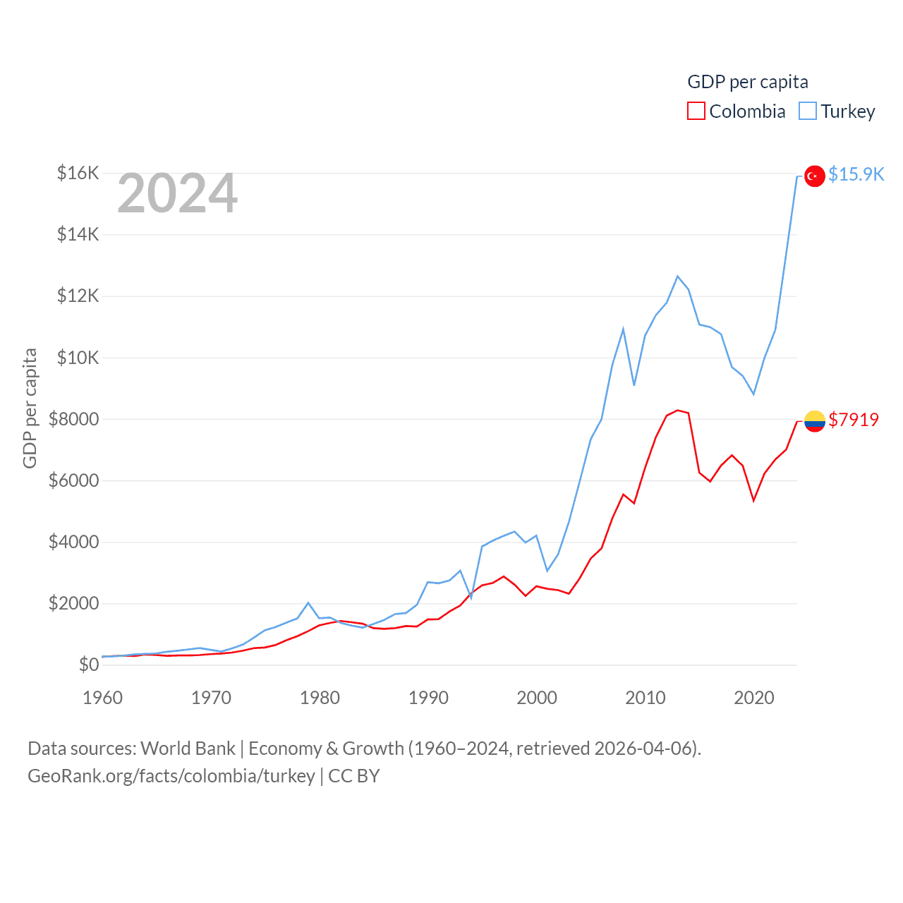 By GDP, Colombia ranks 39/197 ($419B) and Turkey ranks 17/197 ($1.36T). By GDP per capita, Colombia ranks 94/197 ($7,919), while Turkey ranks 66/197 ($15,893).