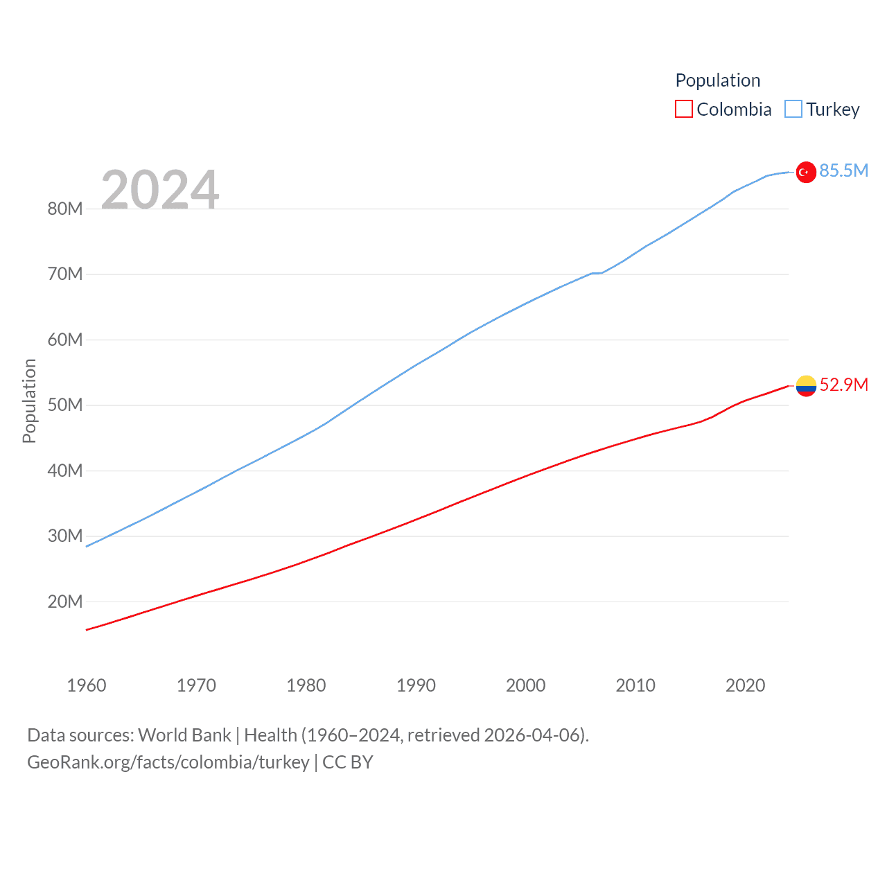 Colombia has a population of 52.9M (ranked 28/197), compared with 85.5M in Turkey (ranked 18/197). Colombia's land area is 428,380 sq mi versus 297,156 sq mi for Turkey (ranked 26th vs. 36th).