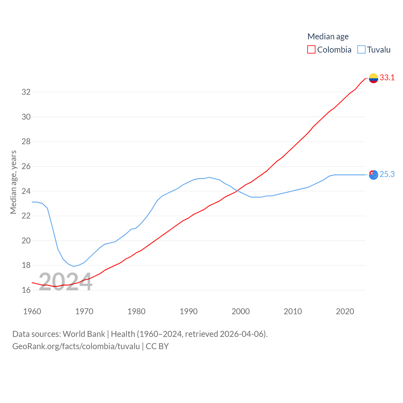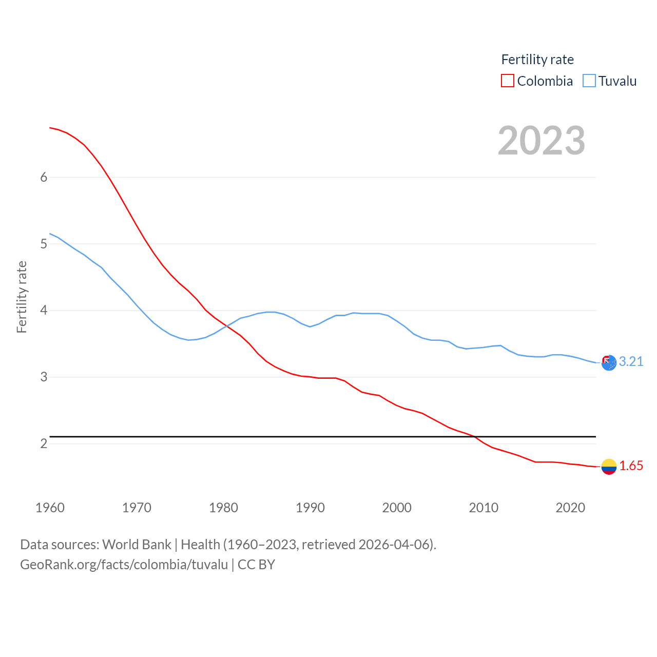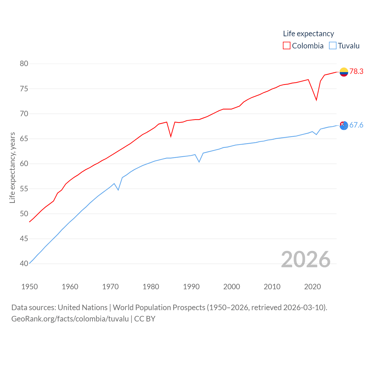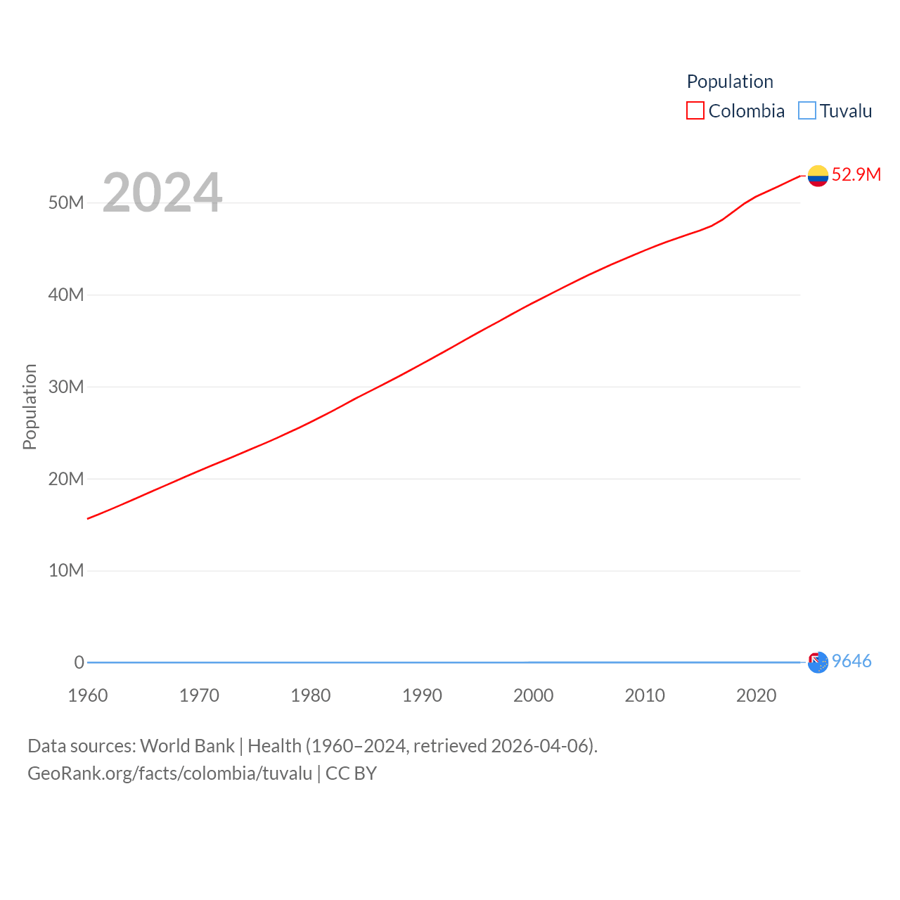Colombia has a population of 52.9M (ranked 28/197), compared with 9.65K in Tuvalu (ranked 196/197). Colombia's land area is 428,380 sq mi versus 11.6 sq mi for Tuvalu (ranked 26th vs. 194th).