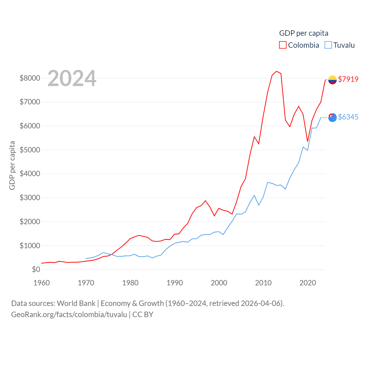 By GDP, Colombia ranks 39/197 ($419B) and Tuvalu ranks 196/197 ($62.3M). By GDP per capita, Colombia ranks 94/197 ($7,919), while Tuvalu ranks 110/197 ($6,345).
