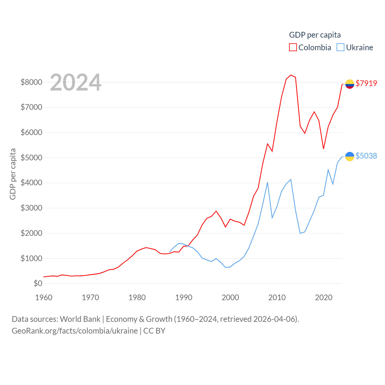 By GDP, Colombia ranks 39/197 ($419B) and Ukraine ranks 57/197 ($191B). By GDP per capita, Colombia ranks 94/197 ($7,919), while Ukraine ranks 120/197 ($5,038).