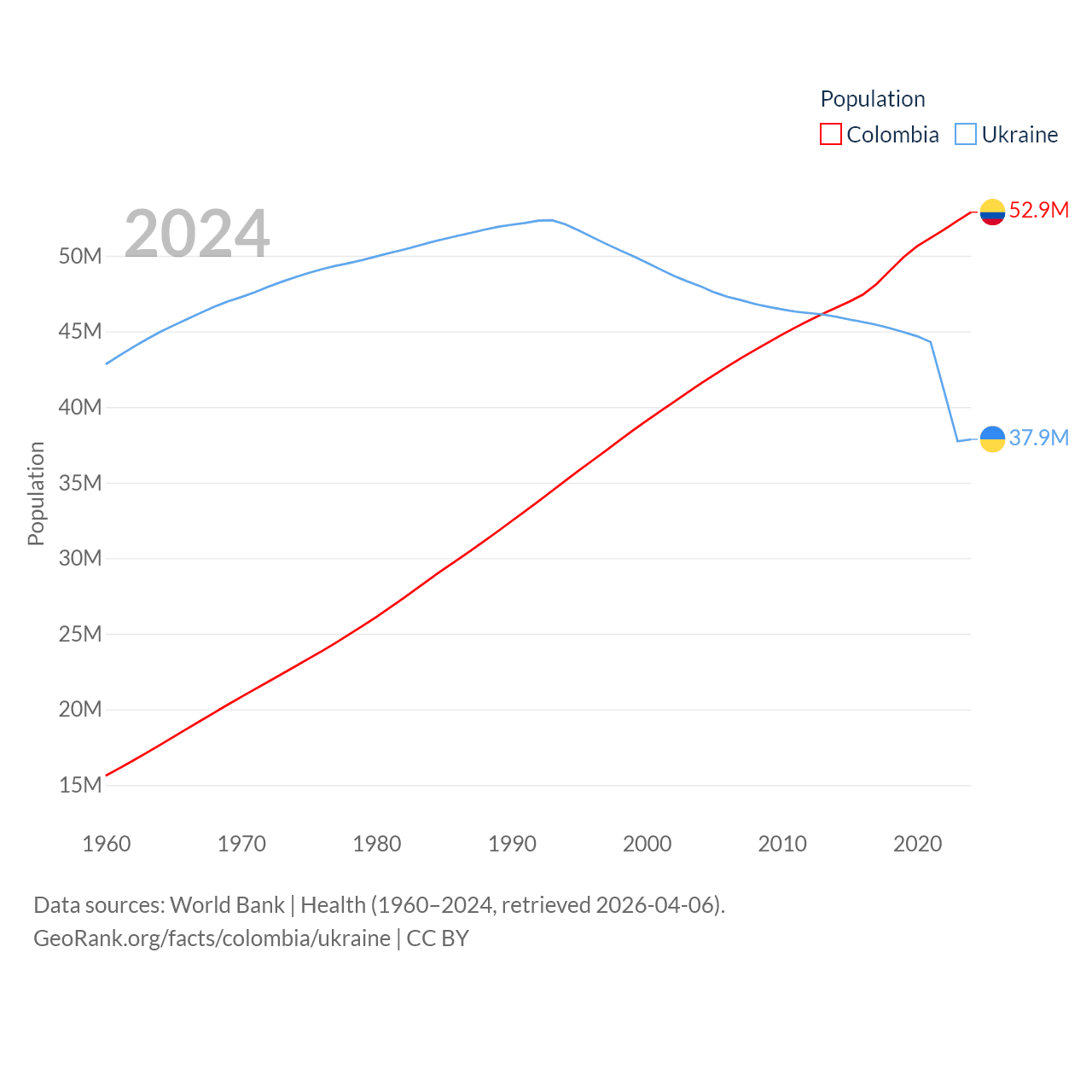 Colombia has a population of 52.9M (ranked 28/197), compared with 37.9M in Ukraine (ranked 41/197). Colombia's land area is 428,380 sq mi versus 223,708 sq mi for Ukraine (ranked 26th vs. 46th).