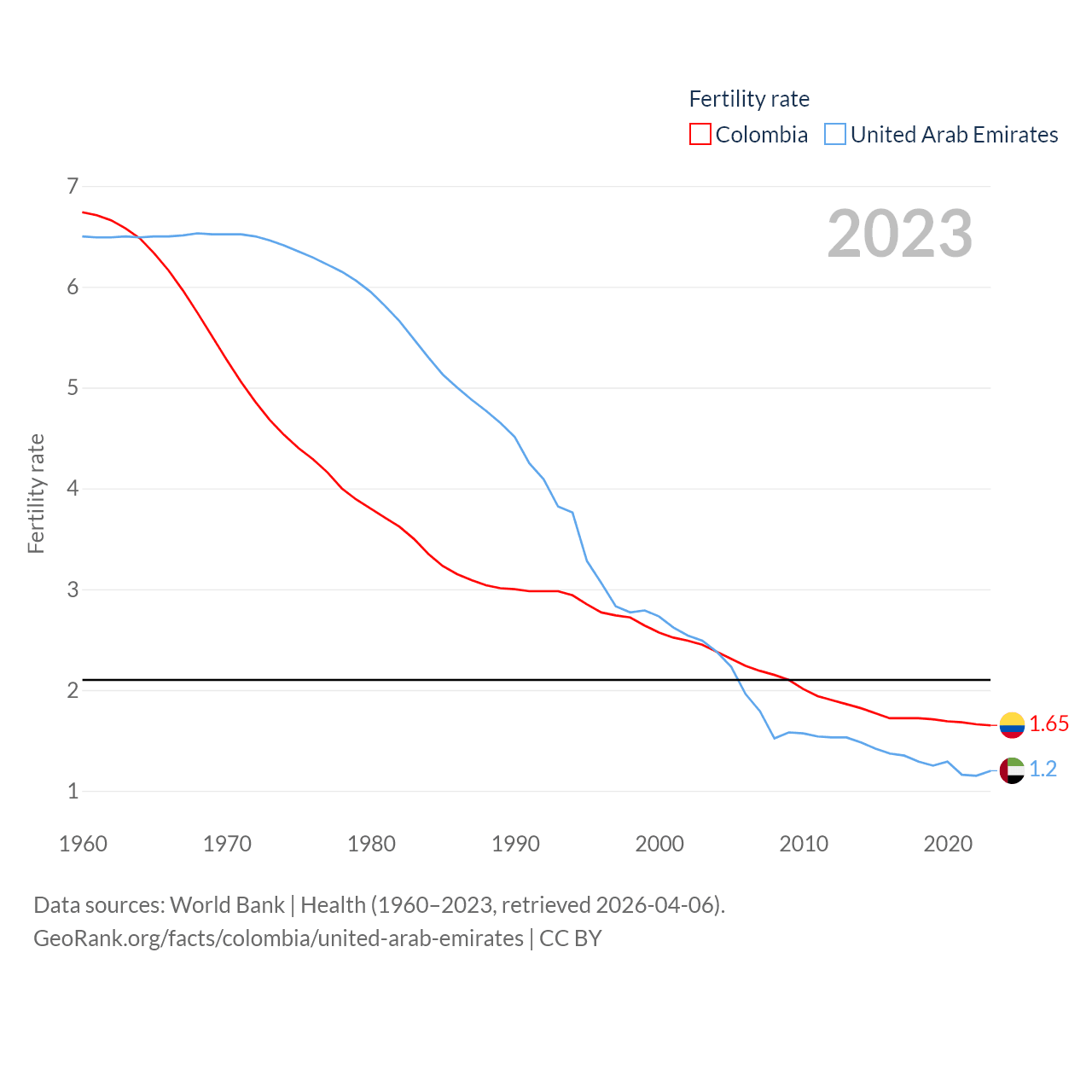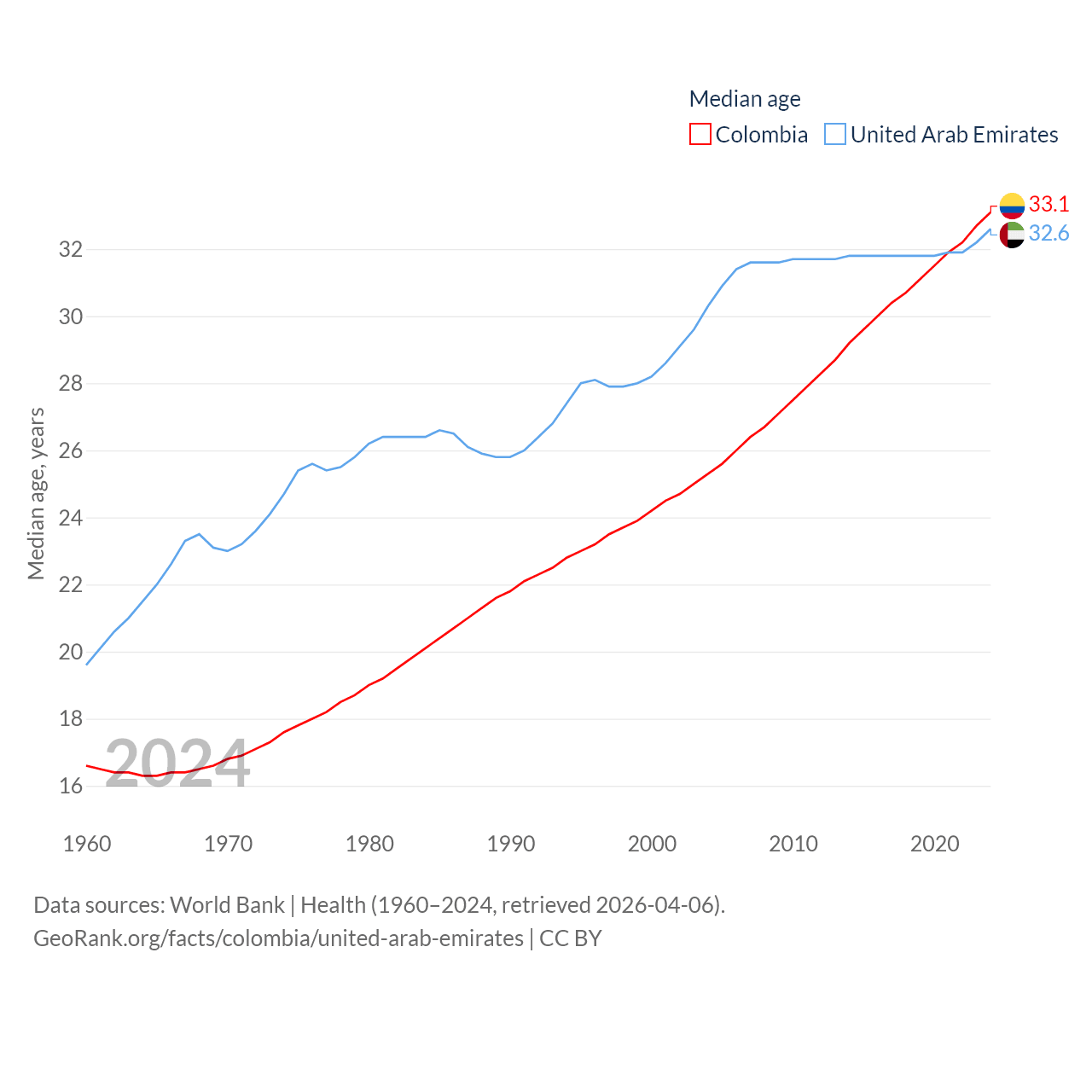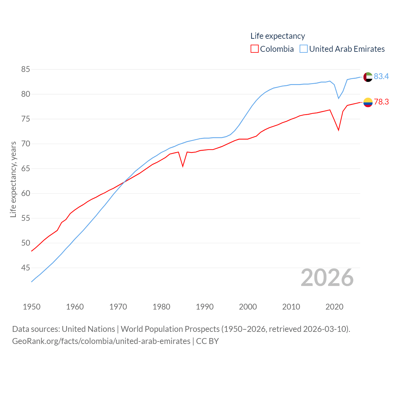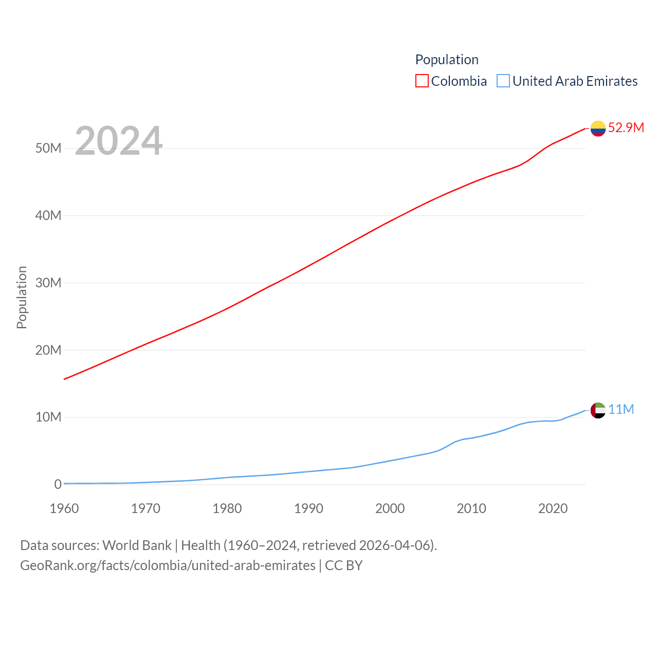 Colombia has a population of 52.9M (ranked 28/197), compared with 11M in The United Arab Emirates (ranked 86/197). Colombia's land area is 428,380 sq mi versus 27,421 sq mi for The United Arab Emirates (ranked 26th vs. 117th).