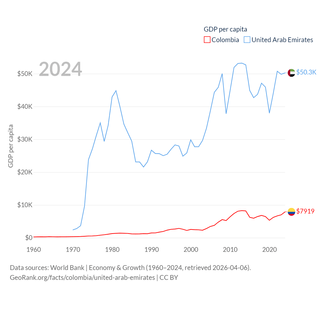 By GDP, Colombia ranks 39/197 ($419B) and The United Arab Emirates ranks 27/197 ($552B). By GDP per capita, Colombia ranks 94/197 ($7,919), while The United Arab Emirates ranks 24/197 ($50,274).