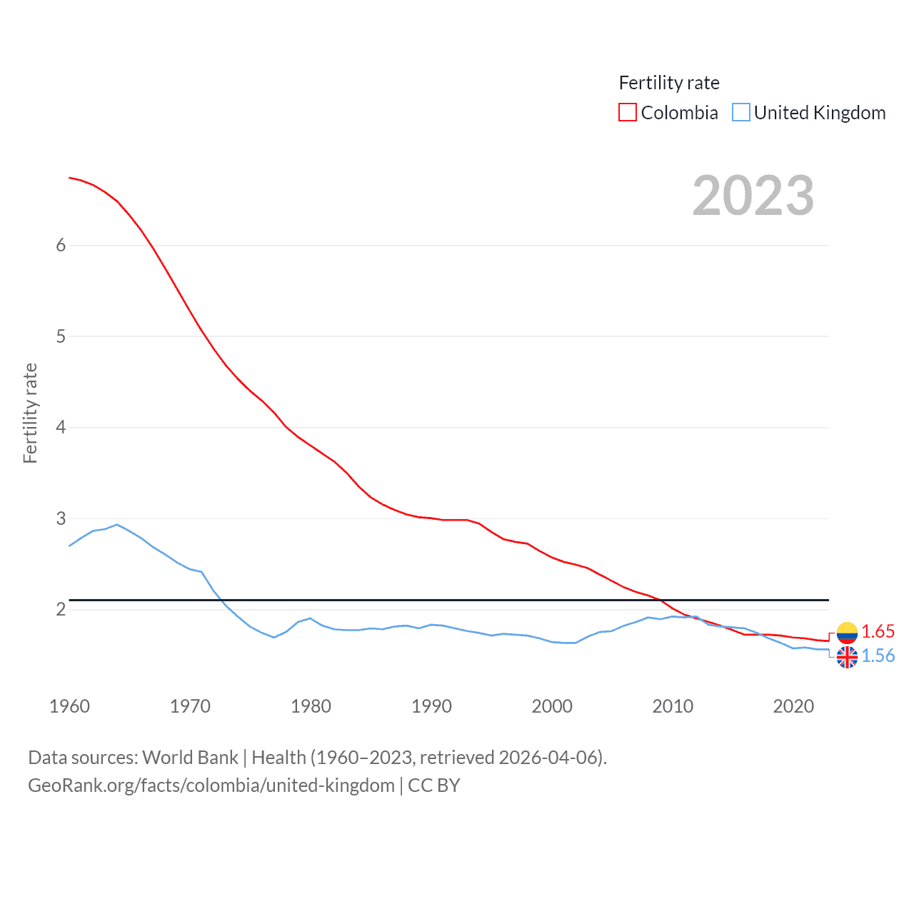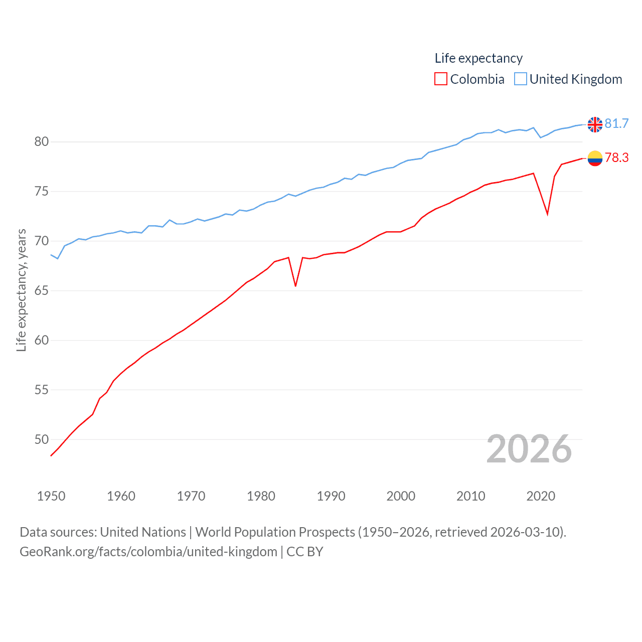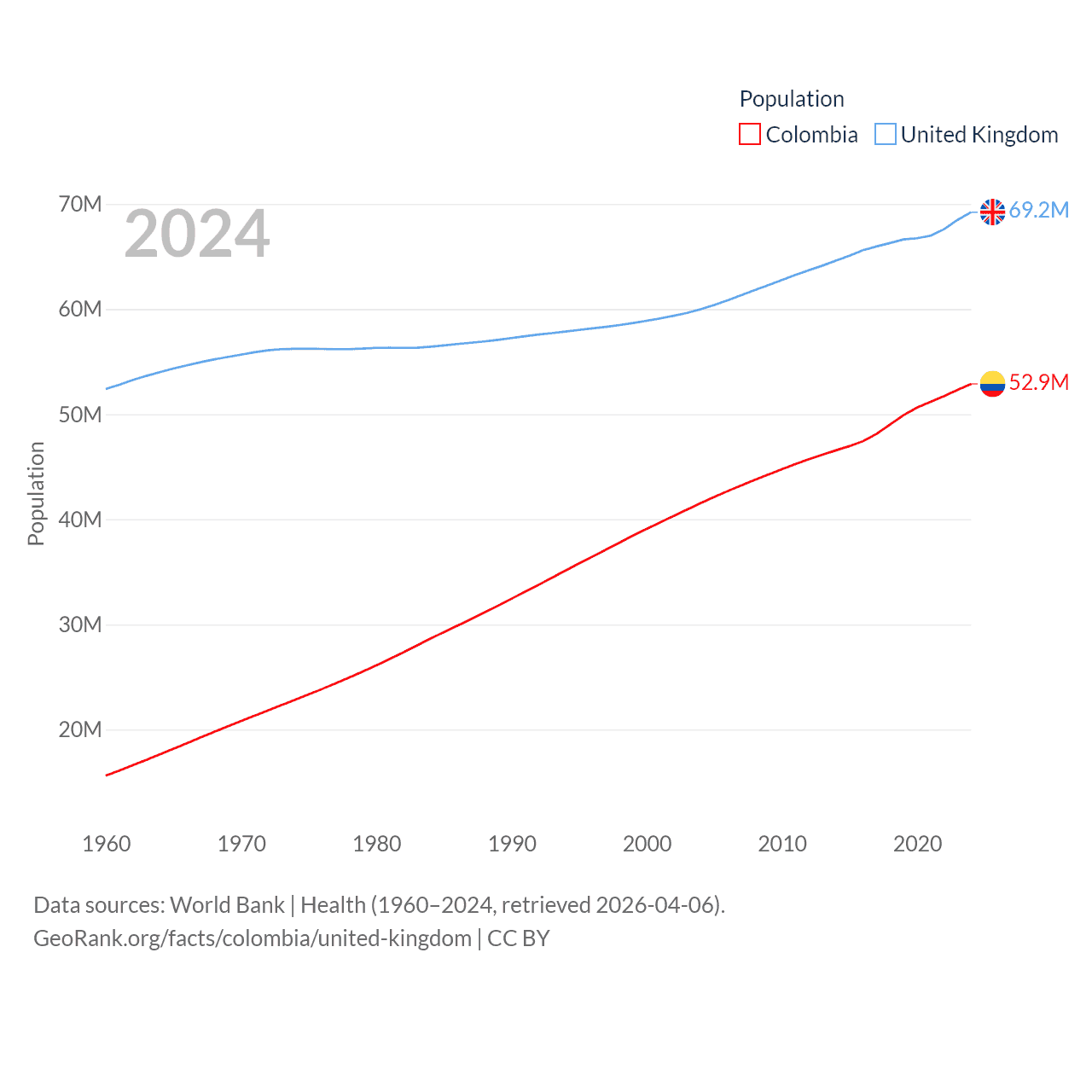 Colombia has a population of 52.9M (ranked 28/197), compared with 69.2M in The United Kingdom (ranked 21/197). Colombia's land area is 428,380 sq mi versus 93,410 sq mi for The United Kingdom (ranked 26th vs. 78th).