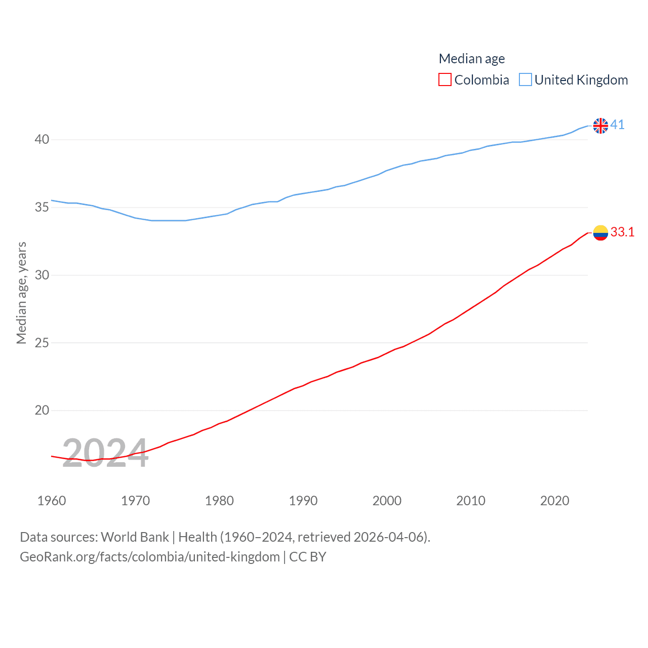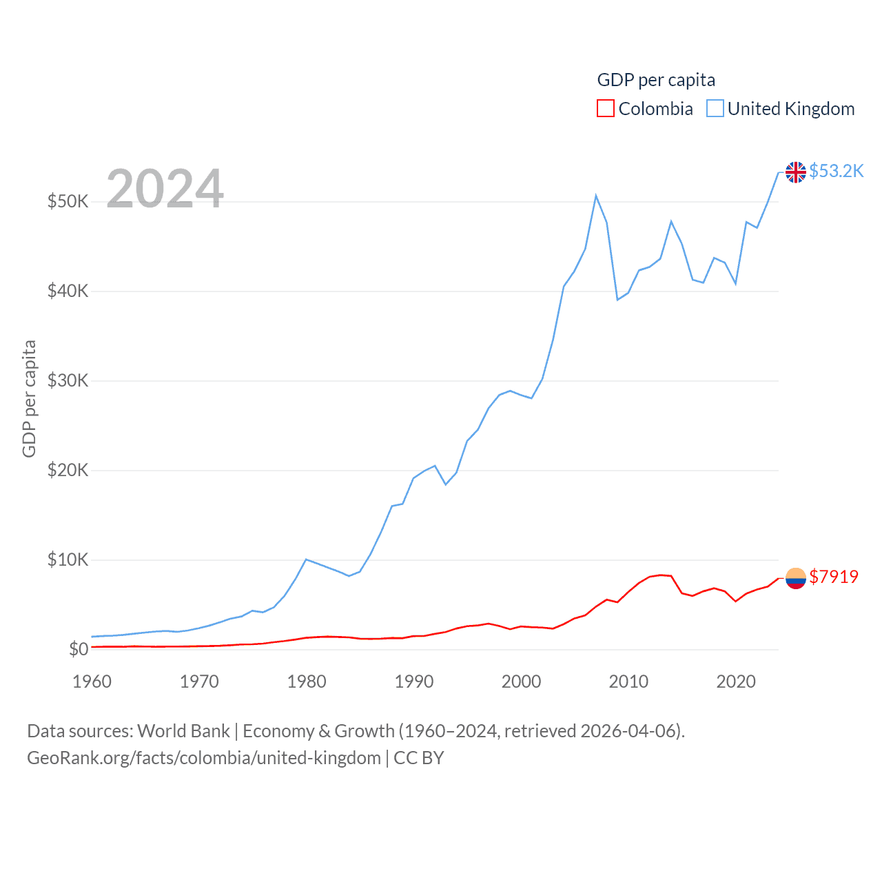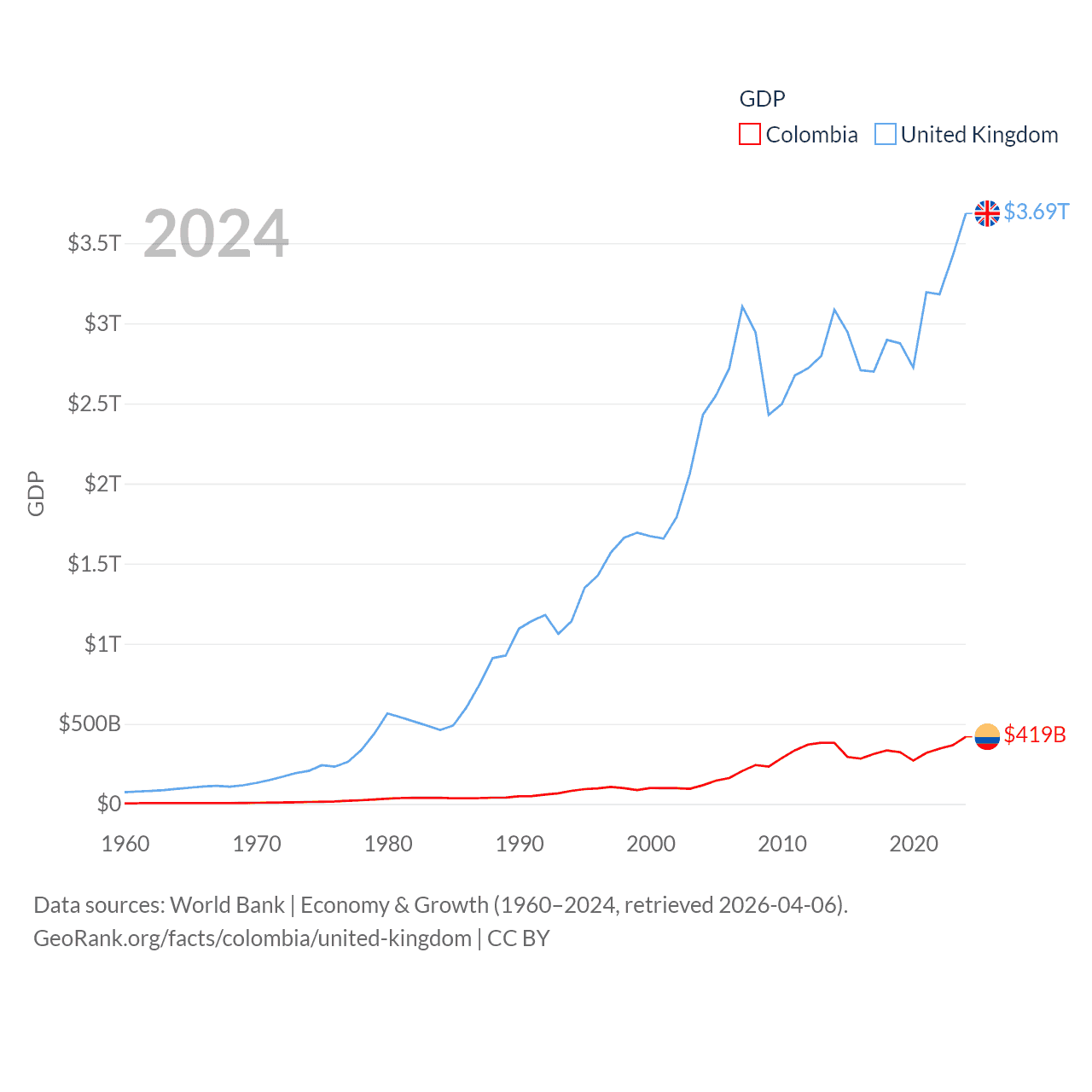 By GDP, Colombia ranks 39/197 ($419B) and The United Kingdom ranks 6/197 ($3.69T). By GDP per capita, Colombia ranks 94/197 ($7,919), while The United Kingdom ranks 22/197 ($53,246).