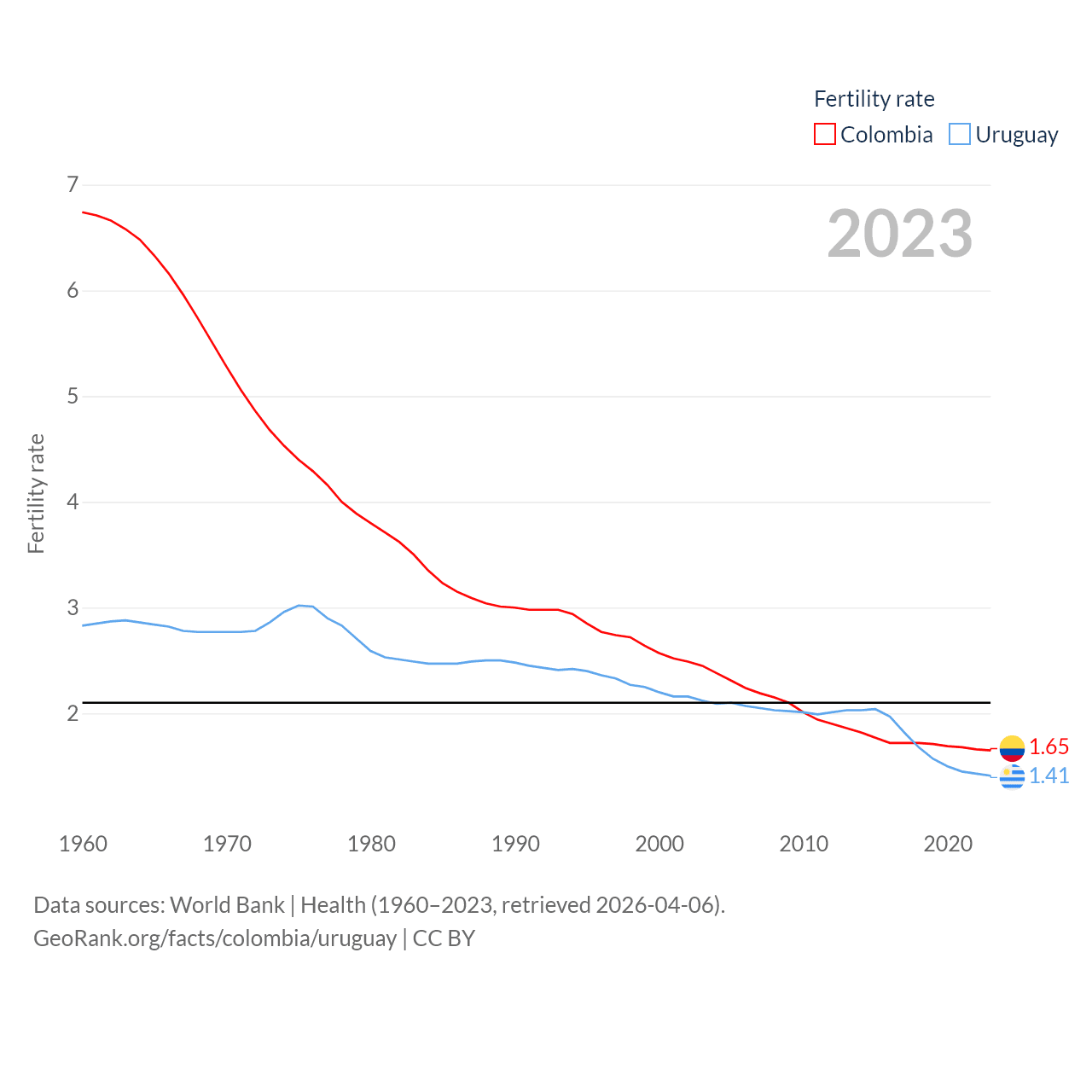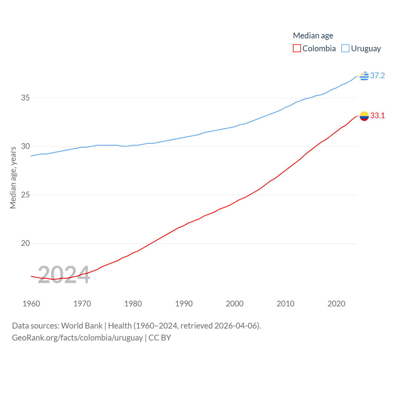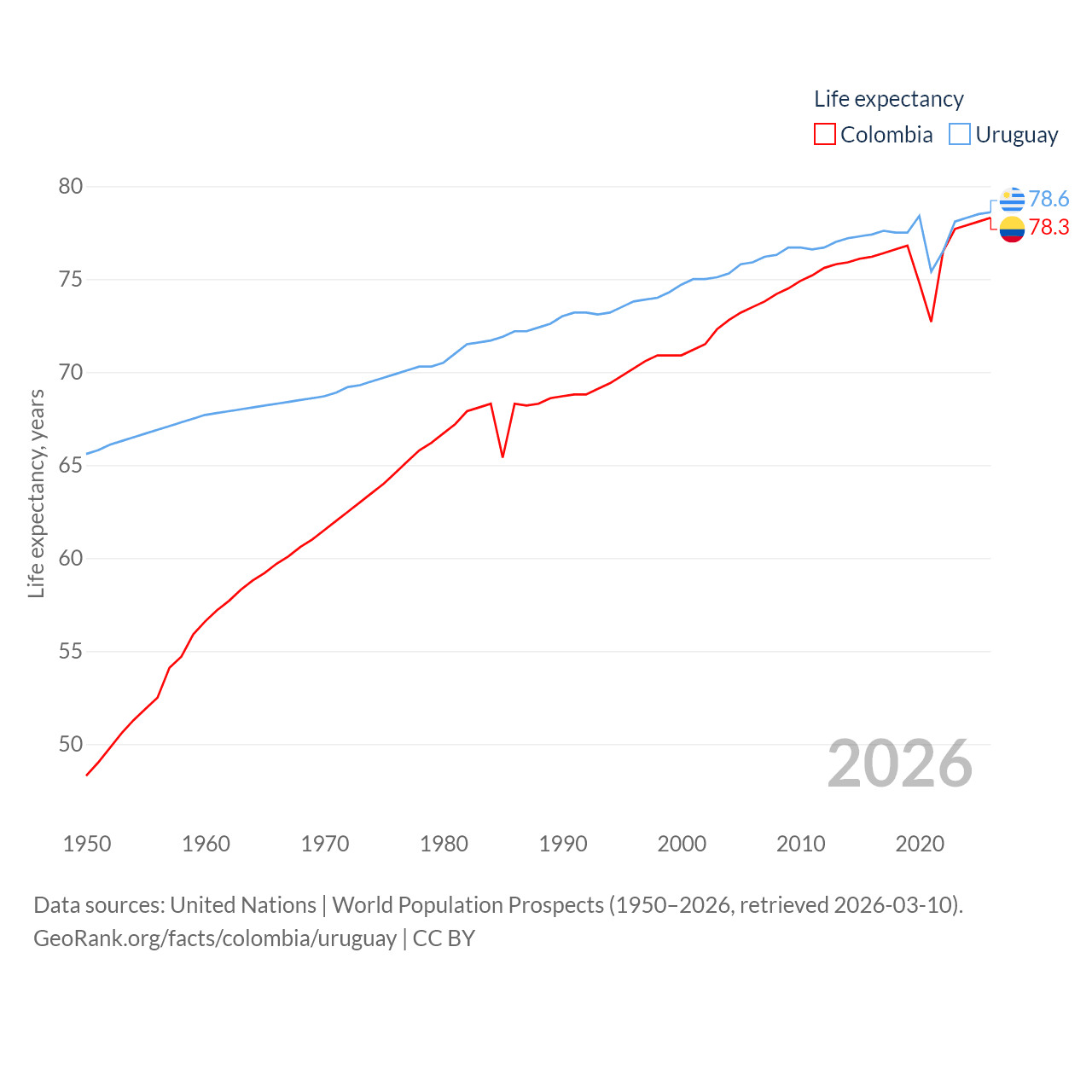Colombia has a population of 52.9M (ranked 28/197), compared with 3.39M in Uruguay (ranked 133/197). Colombia's land area is 428,380 sq mi versus 67,576 sq mi for Uruguay (ranked 26th vs. 89th).