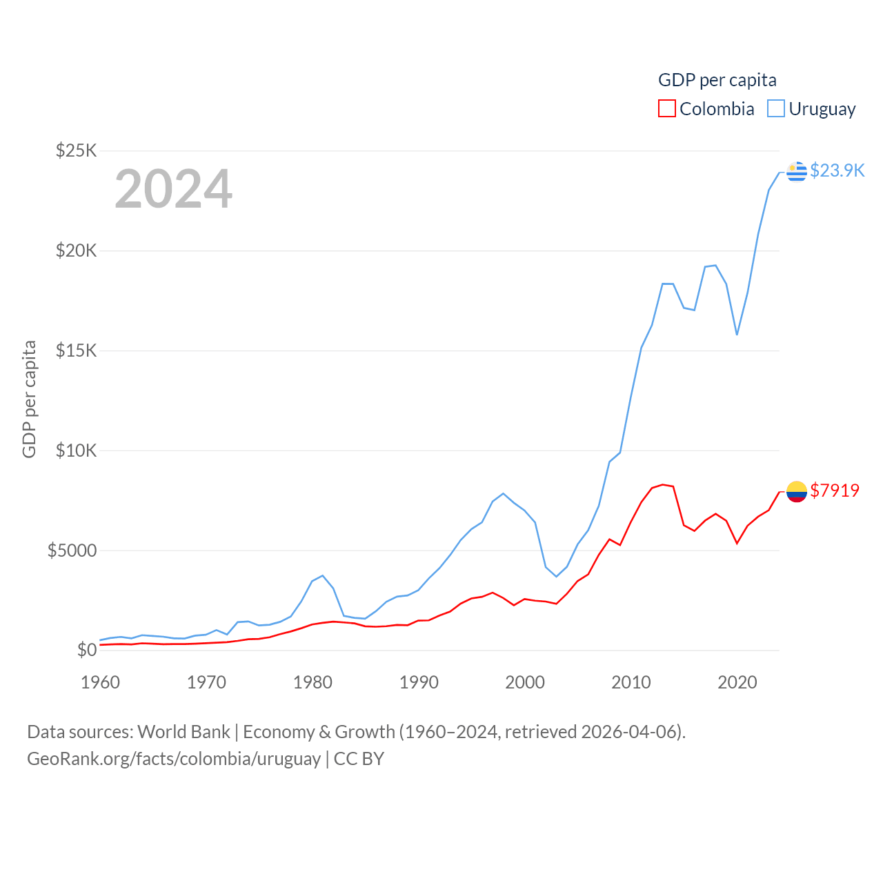 By GDP, Colombia ranks 39/197 ($419B) and Uruguay ranks 81/197 ($81B). By GDP per capita, Colombia ranks 94/197 ($7,919), while Uruguay ranks 52/197 ($23,907).