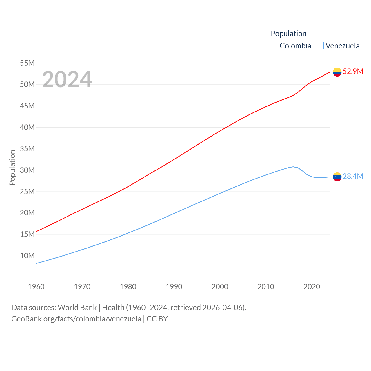 Colombia has a population of 52.9M (ranked 28/197), compared with 28.4M in Venezuela (ranked 53/197). Colombia's land area is 428,380 sq mi versus 340,561 sq mi for Venezuela (ranked 26th vs. 32nd).