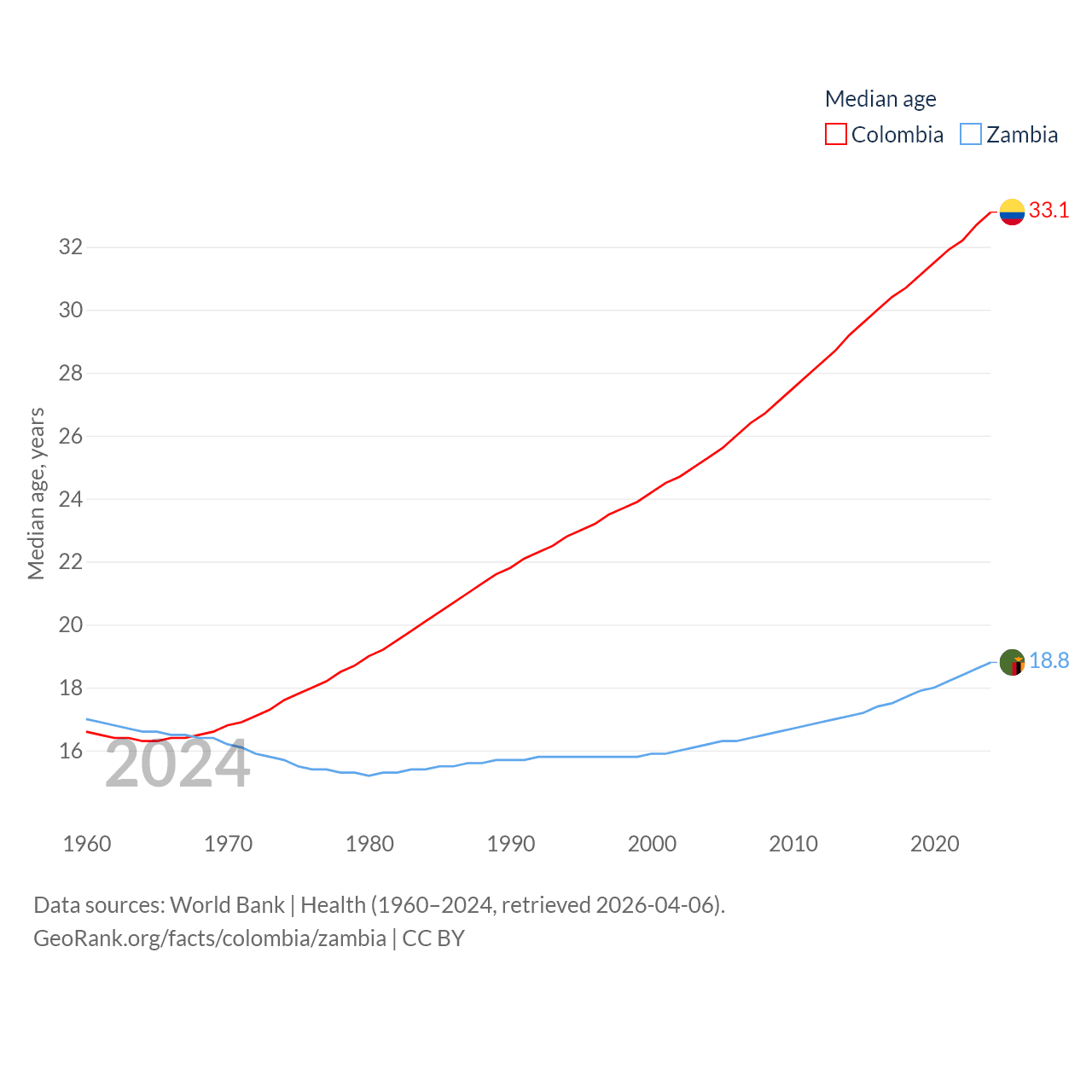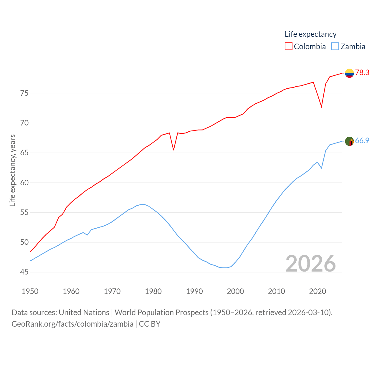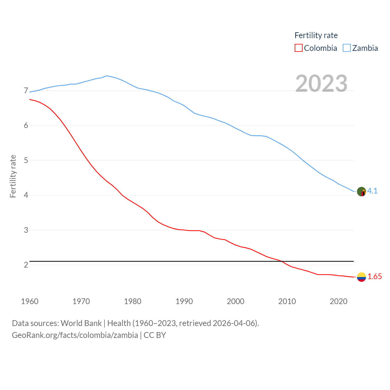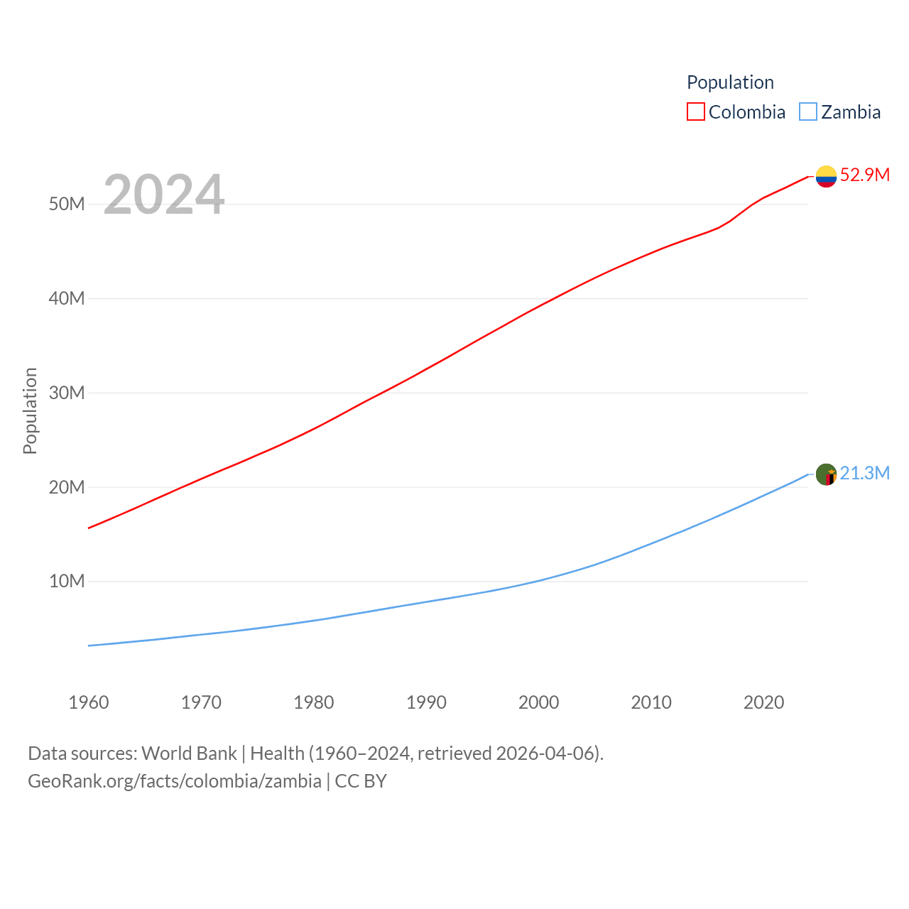 Colombia has a population of 52.9M (ranked 28/197), compared with 21.3M in Zambia (ranked 63/197). Colombia's land area is 428,380 sq mi versus 287,024 sq mi for Zambia (ranked 26th vs. 37th).