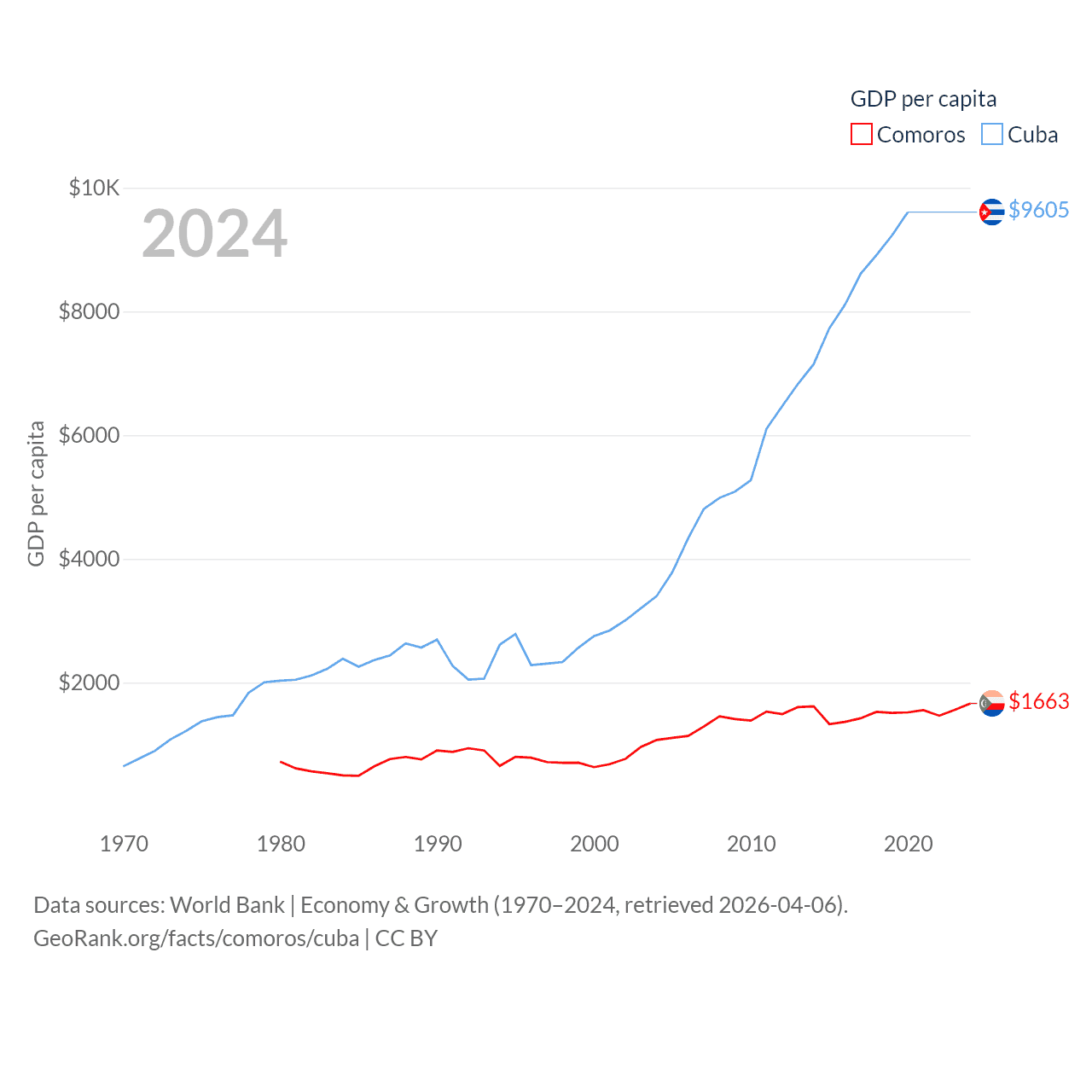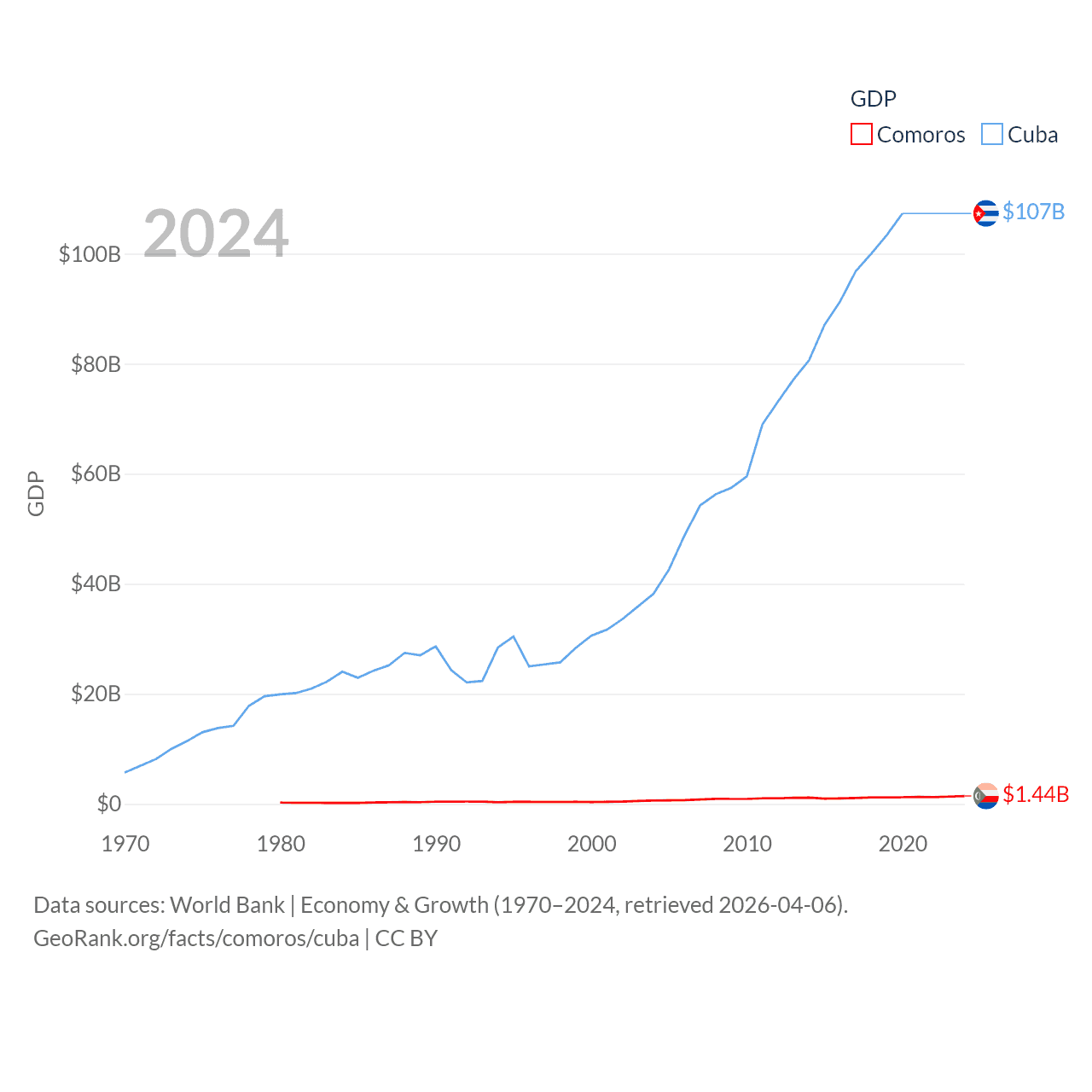 By GDP, Comoros ranks 183/197 ($1.44B) and Cuba ranks 69/197 ($107B). By GDP per capita, Comoros ranks 161/197 ($1,663), while Cuba ranks 86/197 ($9,605).
