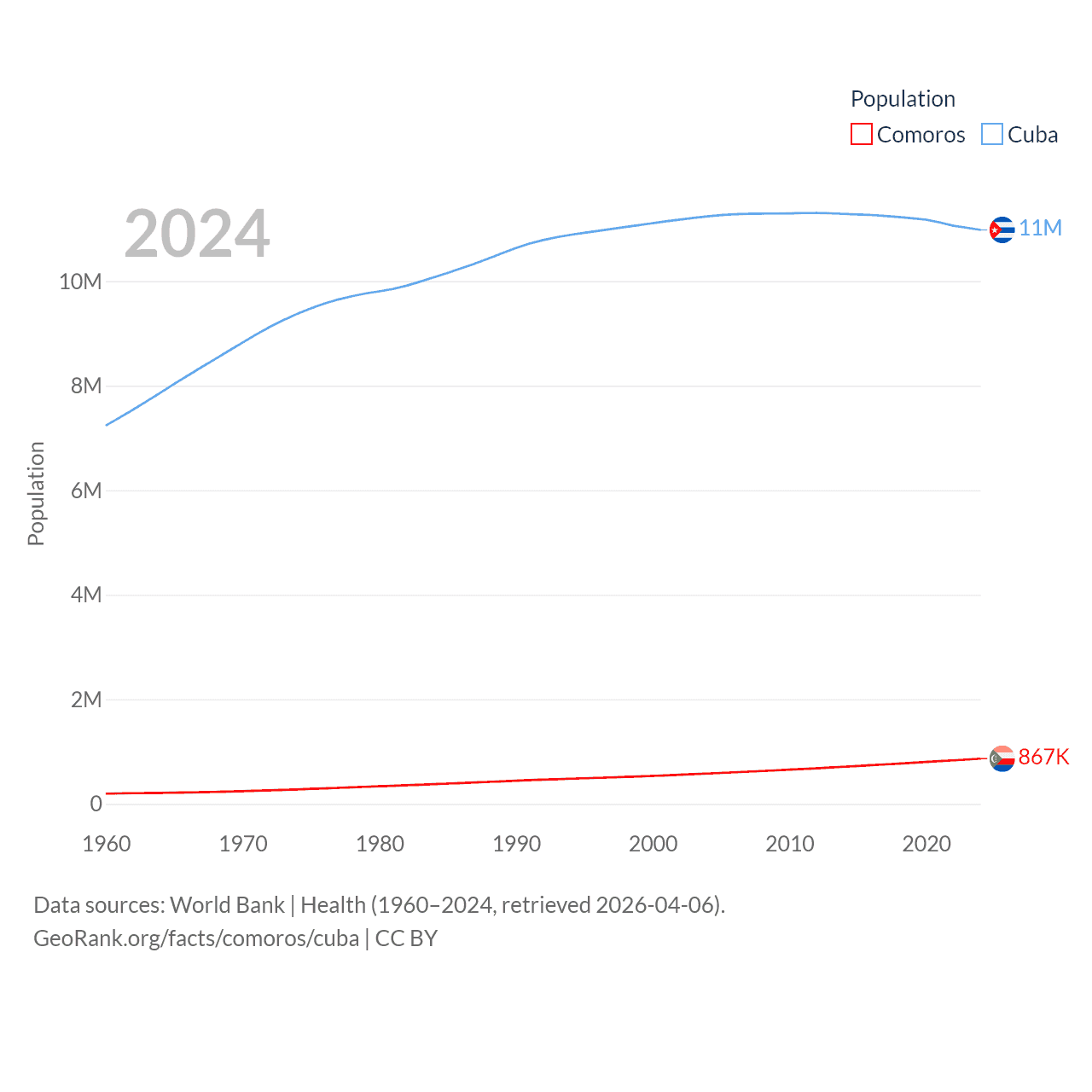 Comoros has a population of 867K (ranked 160/197), compared with 11M in Cuba (ranked 87/197). Comoros' land area is 719 sq mi versus 40,077 sq mi for Cuba (ranked 171st vs. 103rd).