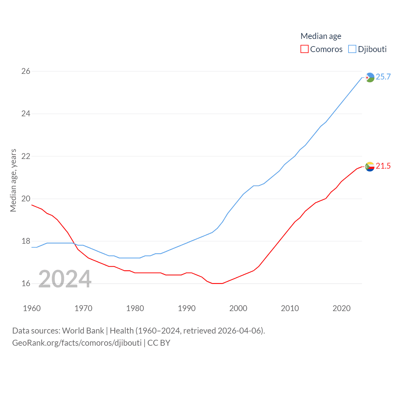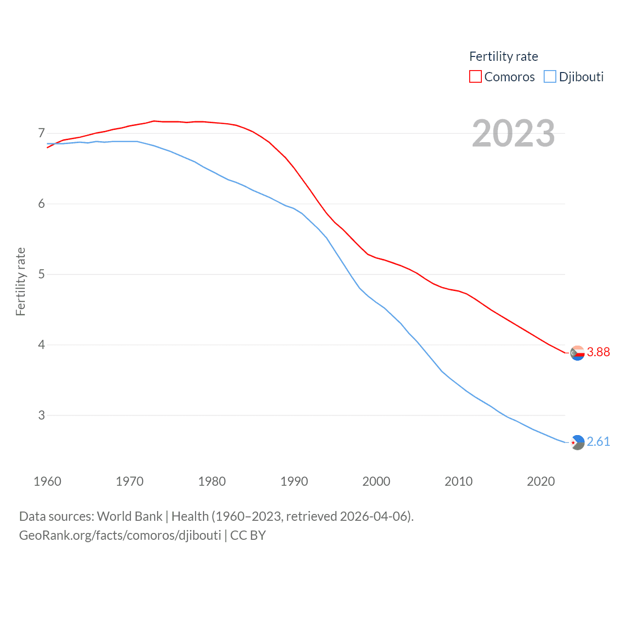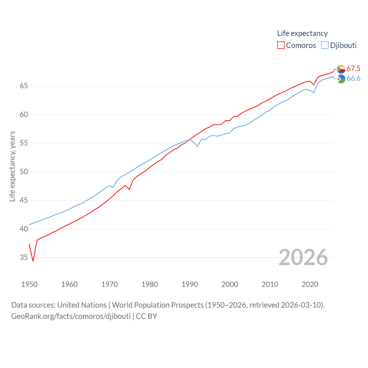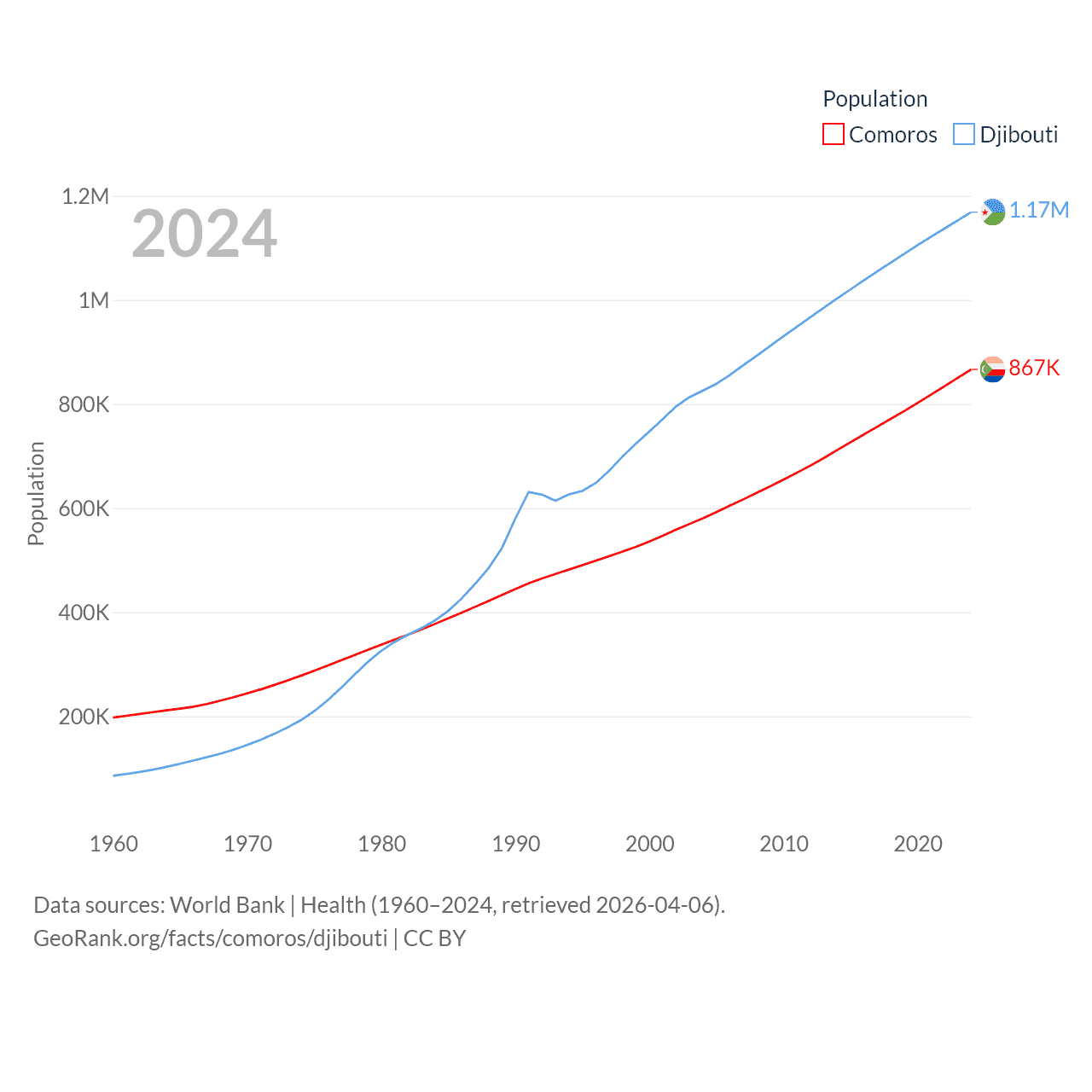 Comoros has a population of 867K (ranked 160/197), compared with 1.17M in Djibouti (ranked 158/197). Comoros' land area is 719 sq mi versus 8,950 sq mi for Djibouti (ranked 171st vs. 147th).