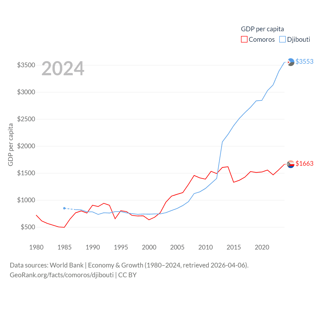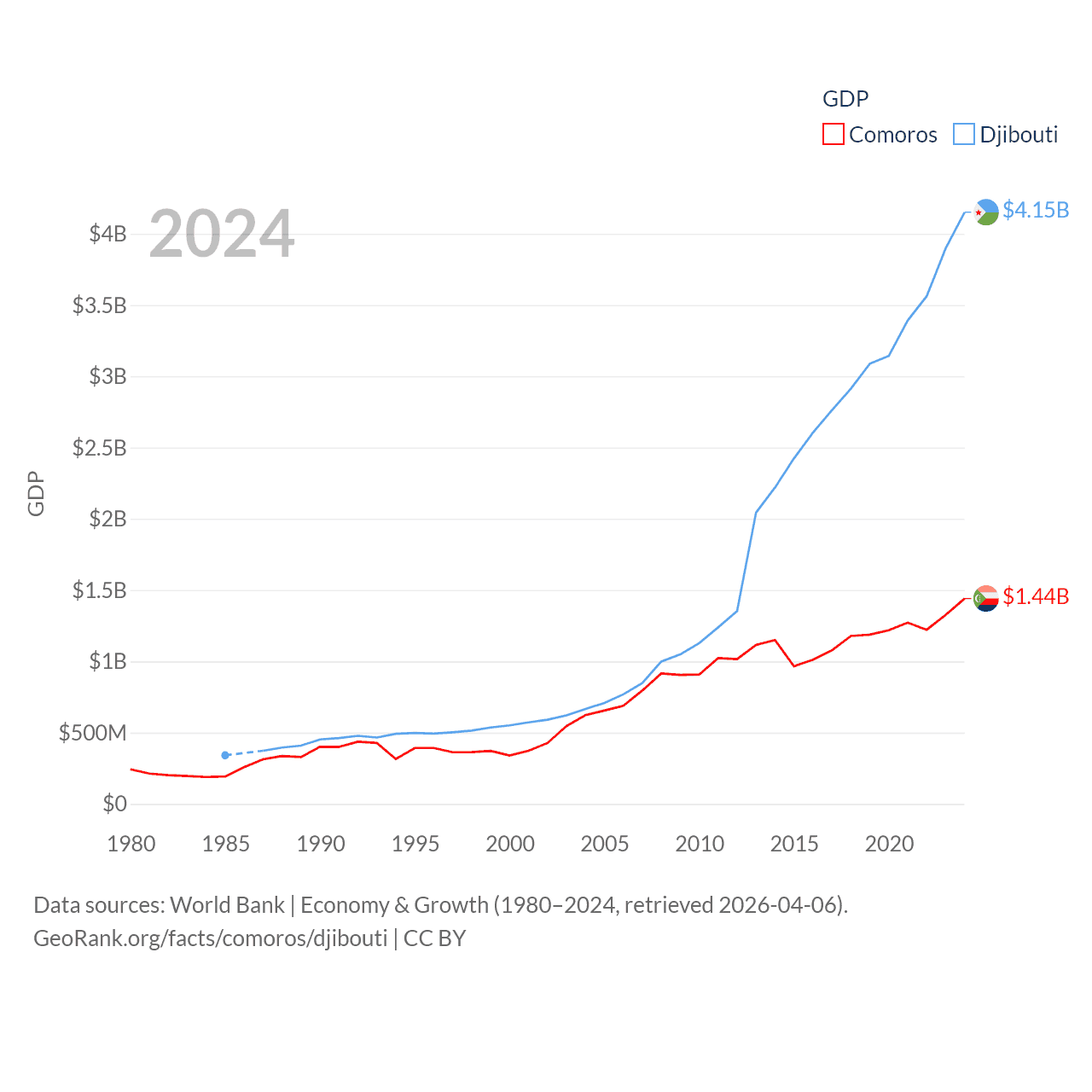 By GDP, Comoros ranks 183/197 ($1.44B) and Djibouti ranks 165/197 ($4.15B). By GDP per capita, Comoros ranks 161/197 ($1,663), while Djibouti ranks 133/197 ($3,553).