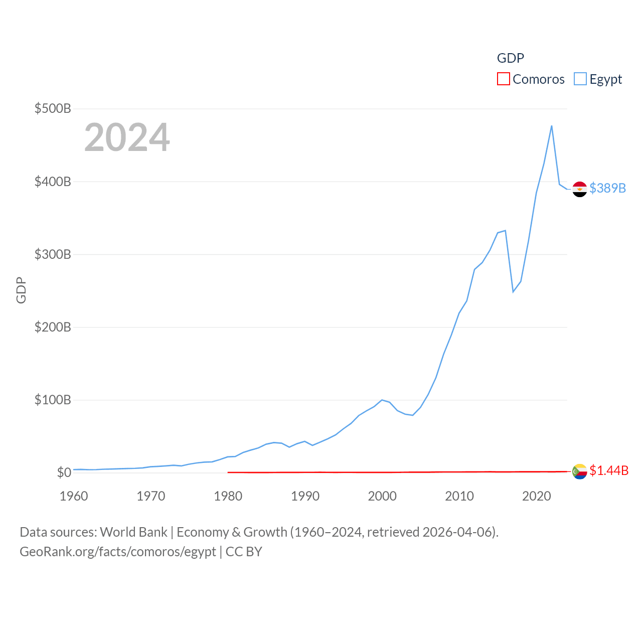 By GDP, Comoros ranks 183/197 ($1.44B) and Egypt ranks 41/197 ($389B). By GDP per capita, Comoros ranks 161/197 ($1,663), while Egypt ranks 138/197 ($3,338).