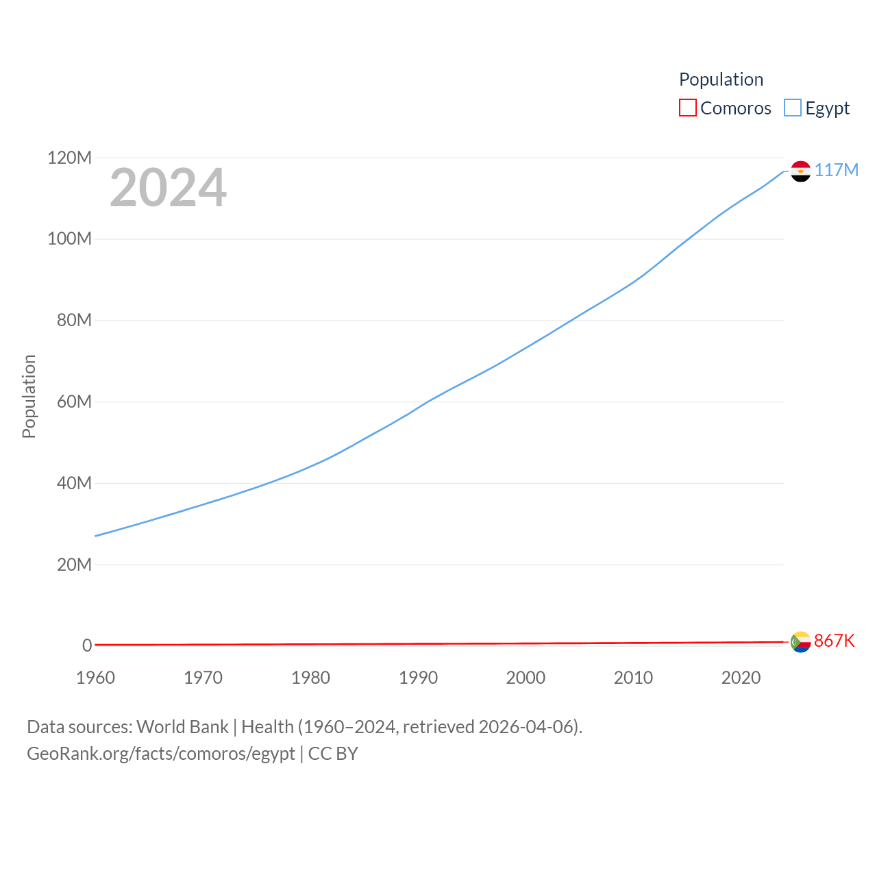 Comoros has a population of 867K (ranked 160/197), compared with 117M in Egypt (ranked 13/197). Comoros' land area is 719 sq mi versus 384,345 sq mi for Egypt (ranked 171st vs. 29th).