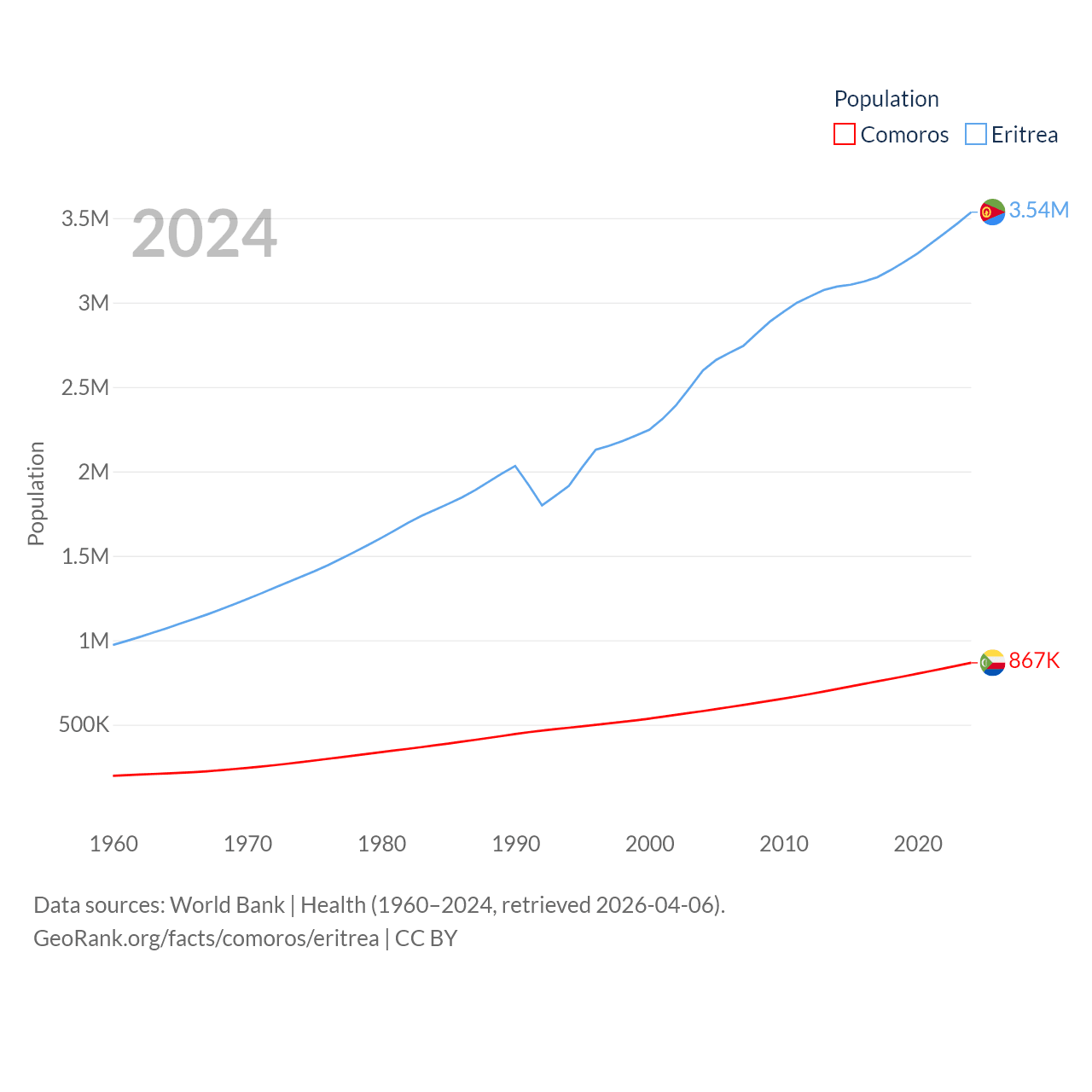 Comoros has a population of 867K (ranked 160/197), compared with 3.54M in Eritrea (ranked 131/197). Comoros' land area is 719 sq mi versus 46,787 sq mi for Eritrea (ranked 171st vs. 96th).
