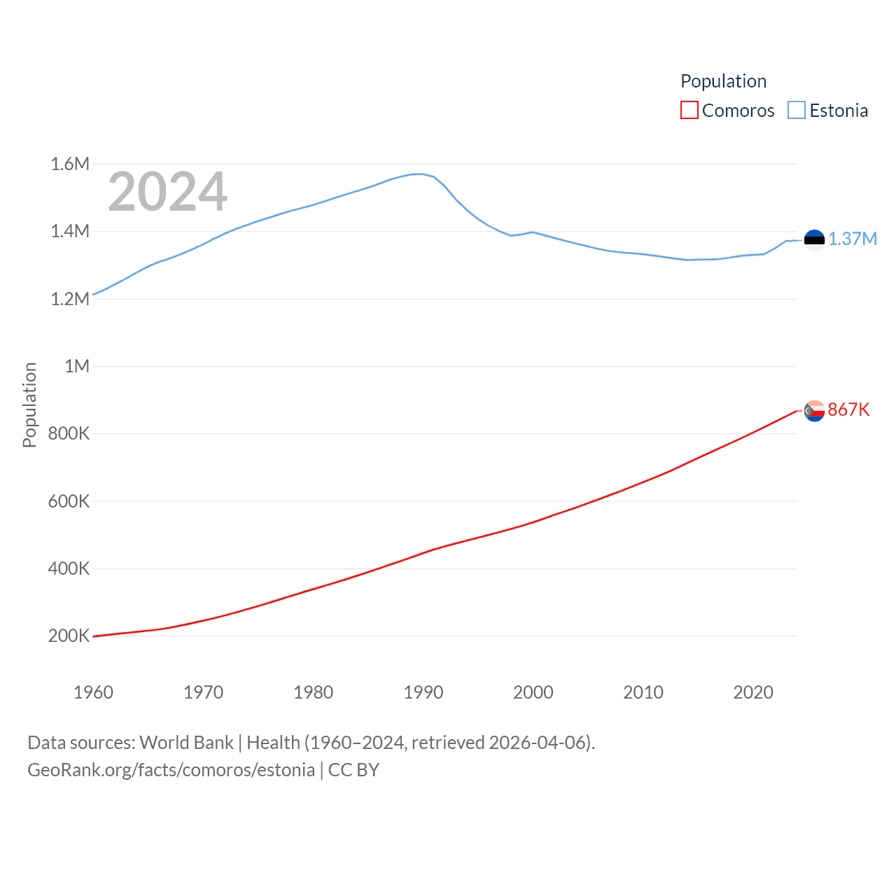 Comoros has a population of 867K (ranked 160/197), compared with 1.37M in Estonia (ranked 153/197). Comoros' land area is 719 sq mi versus 16,498 sq mi for Estonia (ranked 171st vs. 129th).