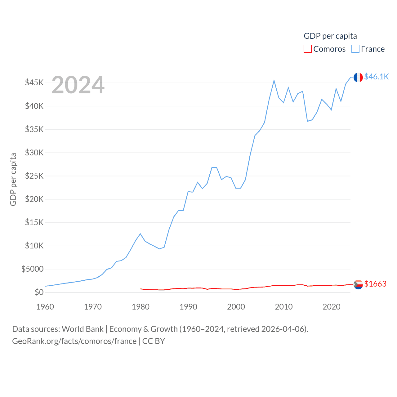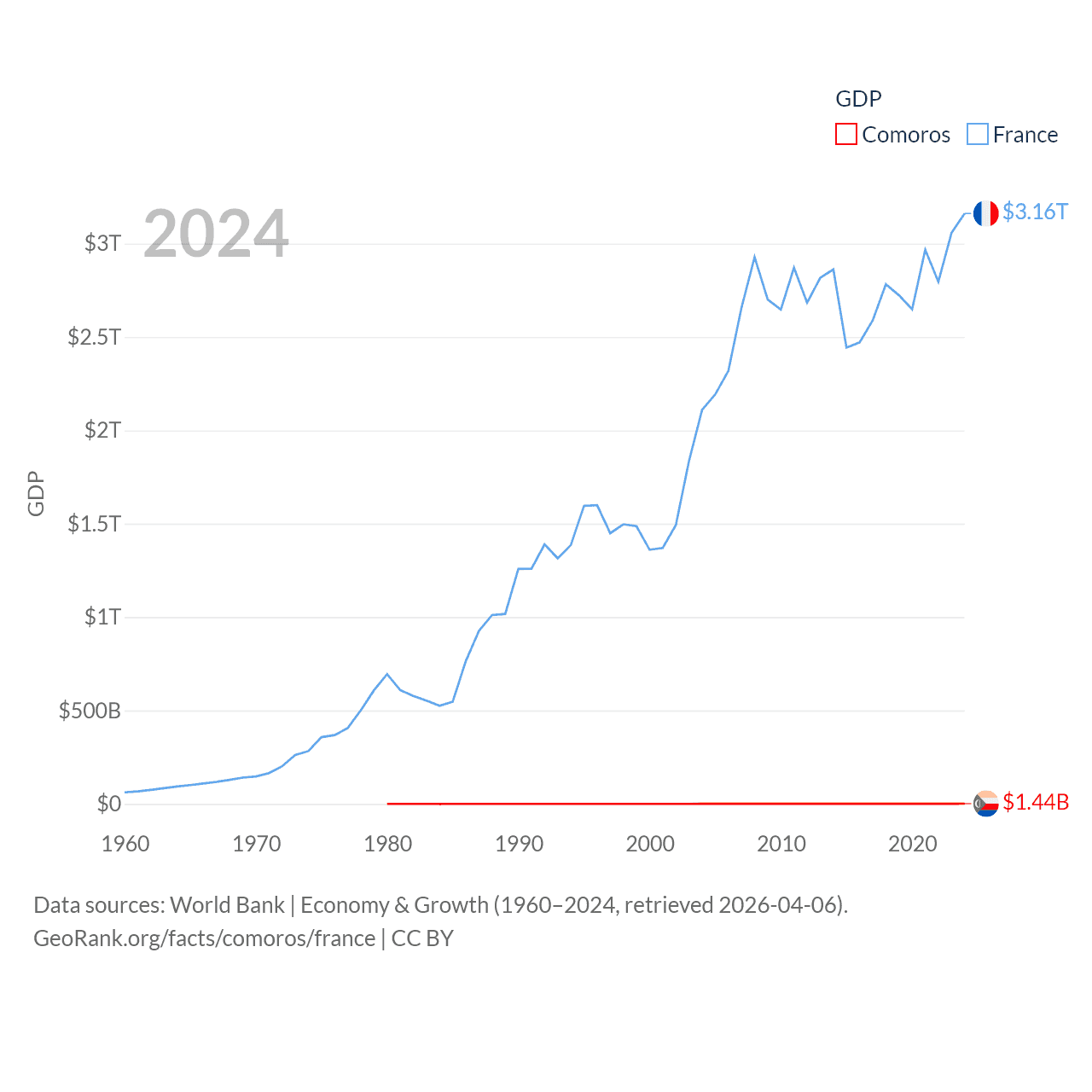 By GDP, Comoros ranks 183/197 ($1.44B) and France ranks 7/197 ($3.16T). By GDP per capita, Comoros ranks 161/197 ($1,663), while France ranks 27/197 ($46,103).