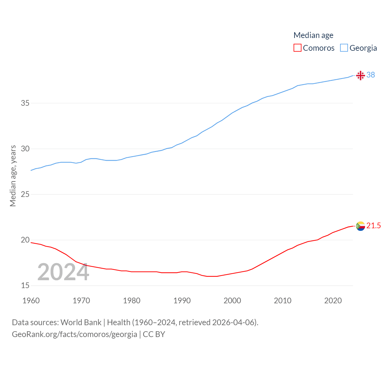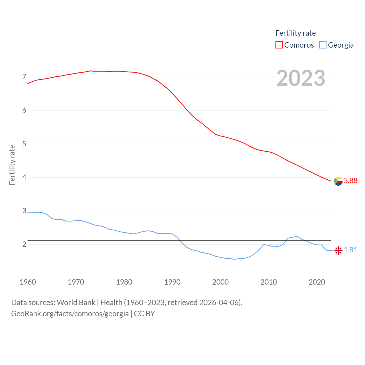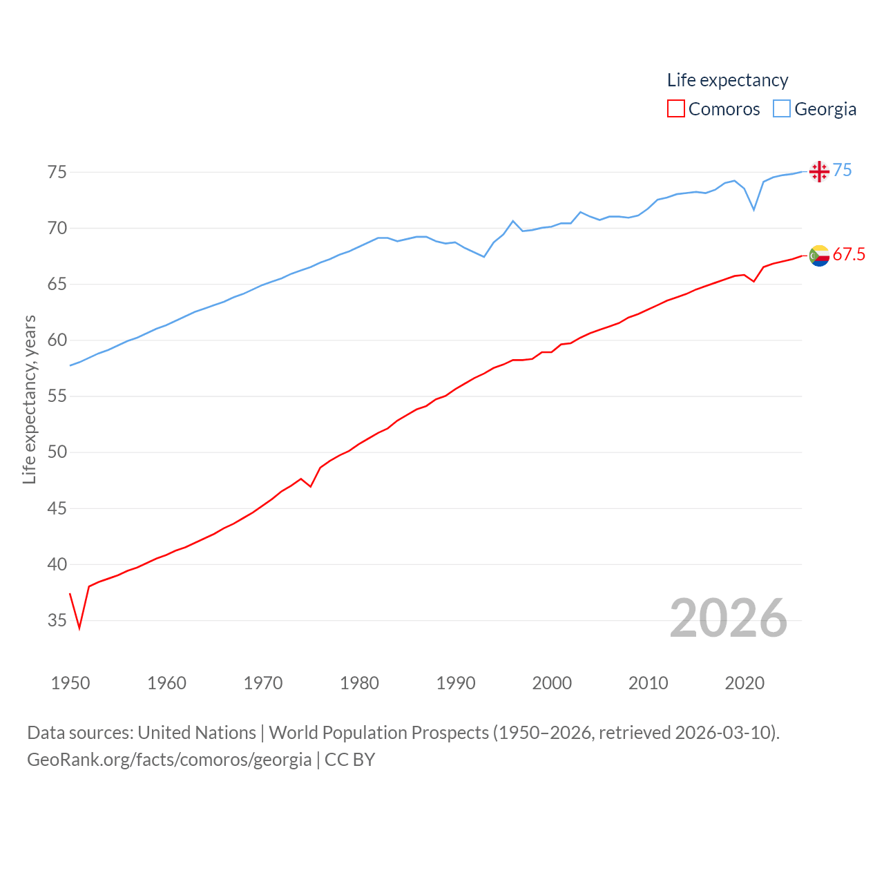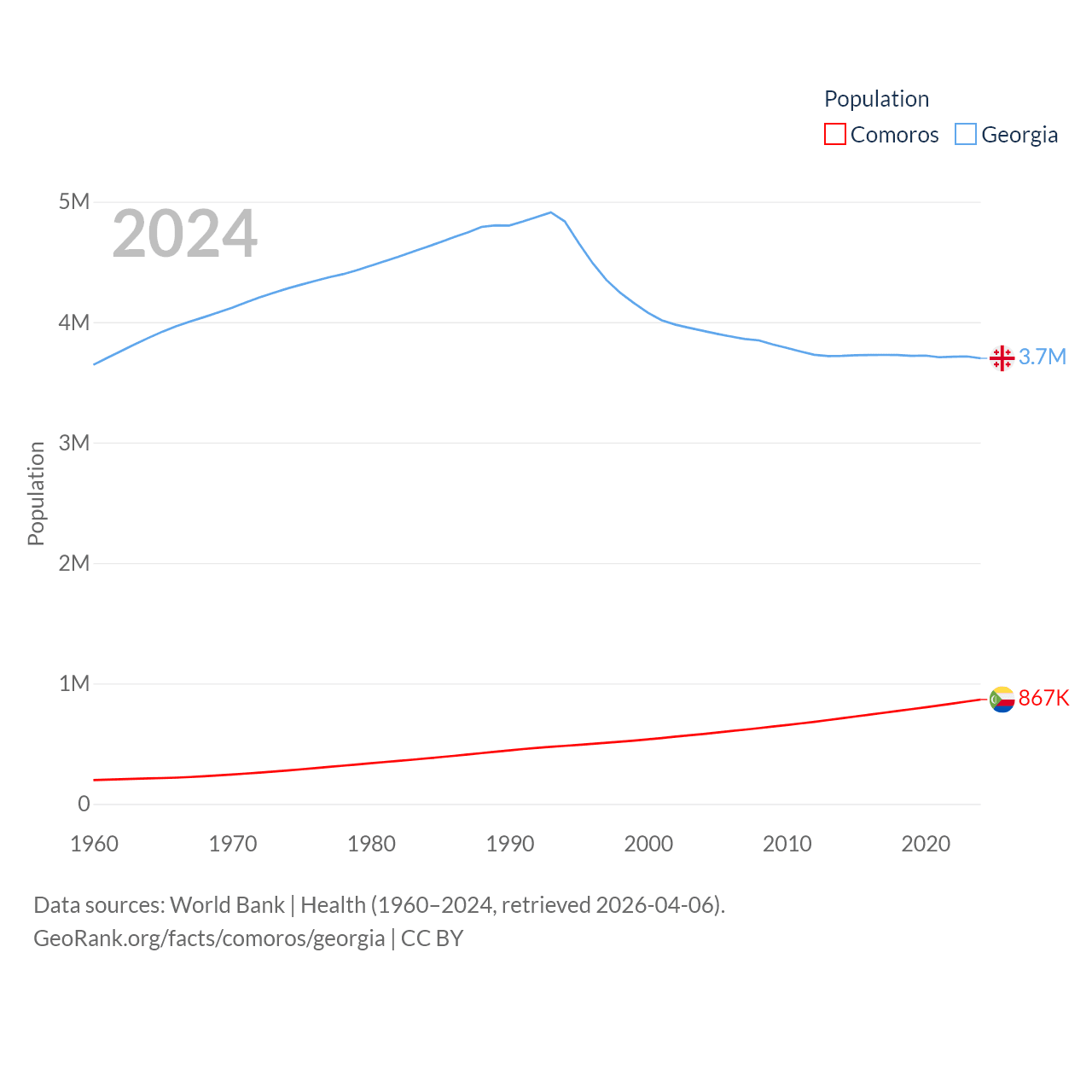 Comoros has a population of 867K (ranked 160/197), compared with 3.7M in Georgia (ranked 130/197). Comoros' land area is 719 sq mi versus 26,830 sq mi for Georgia (ranked 171st vs. 118th).