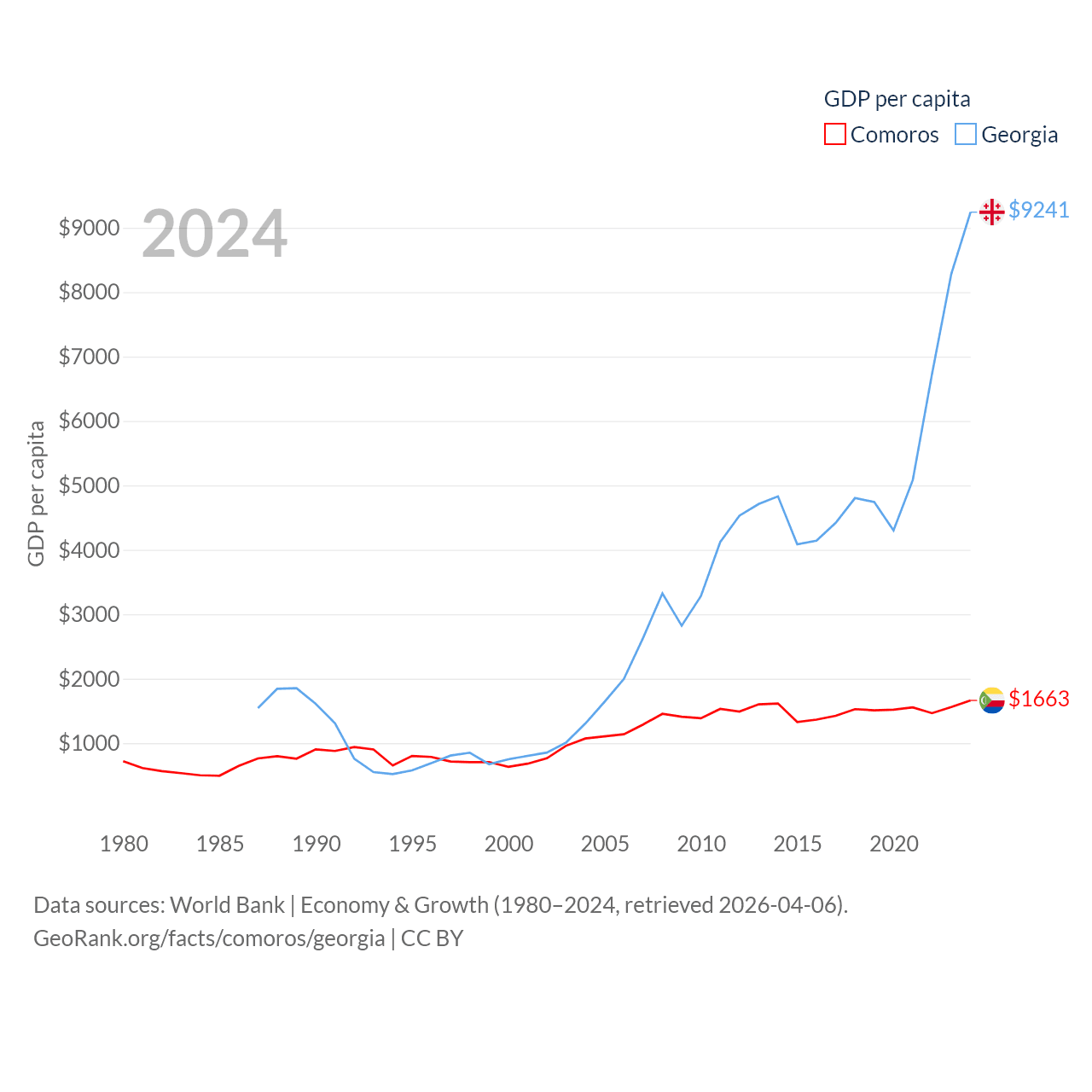 By GDP, Comoros ranks 183/197 ($1.44B) and Georgia ranks 107/197 ($34.2B). By GDP per capita, Comoros ranks 161/197 ($1,663), while Georgia ranks 89/197 ($9,241).