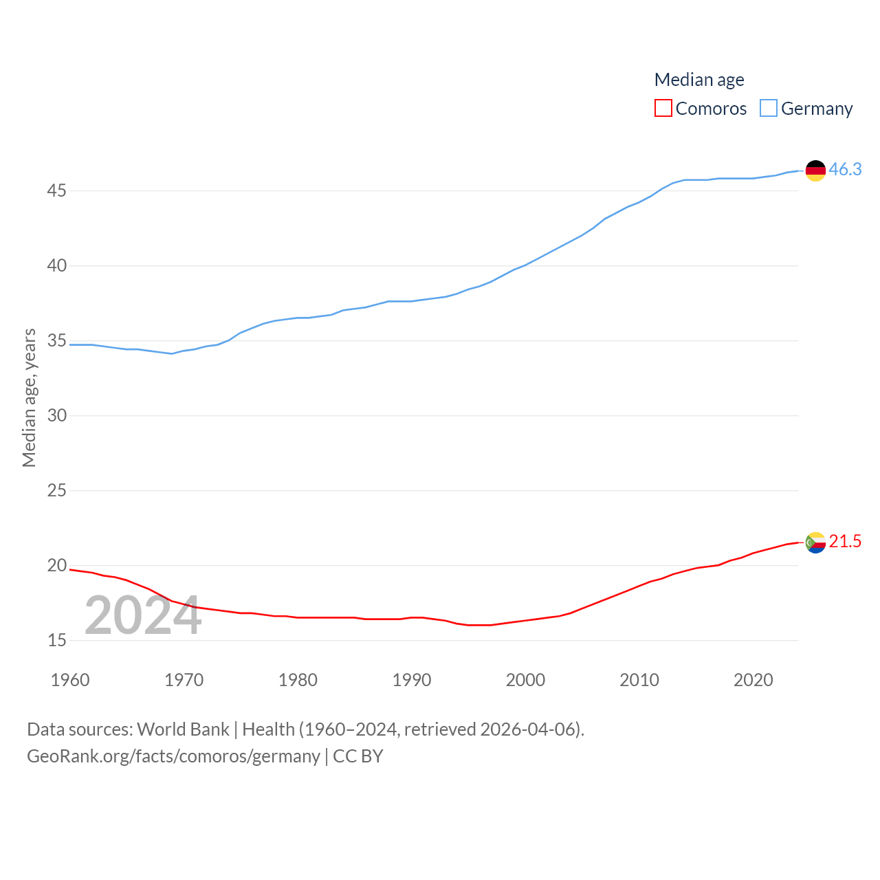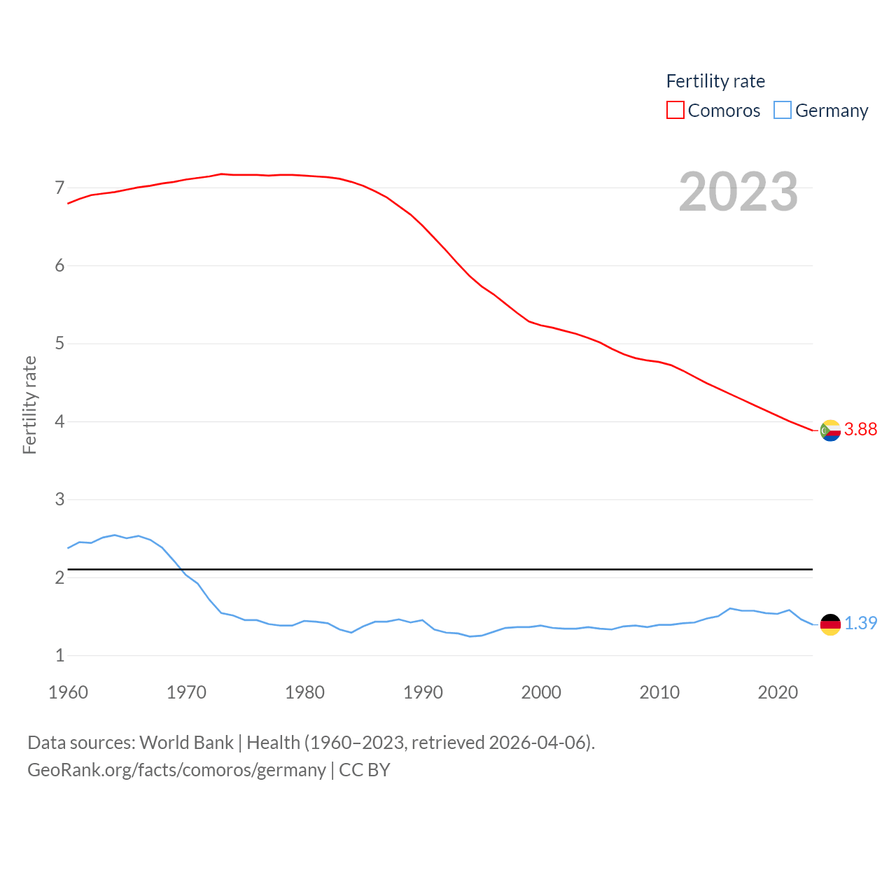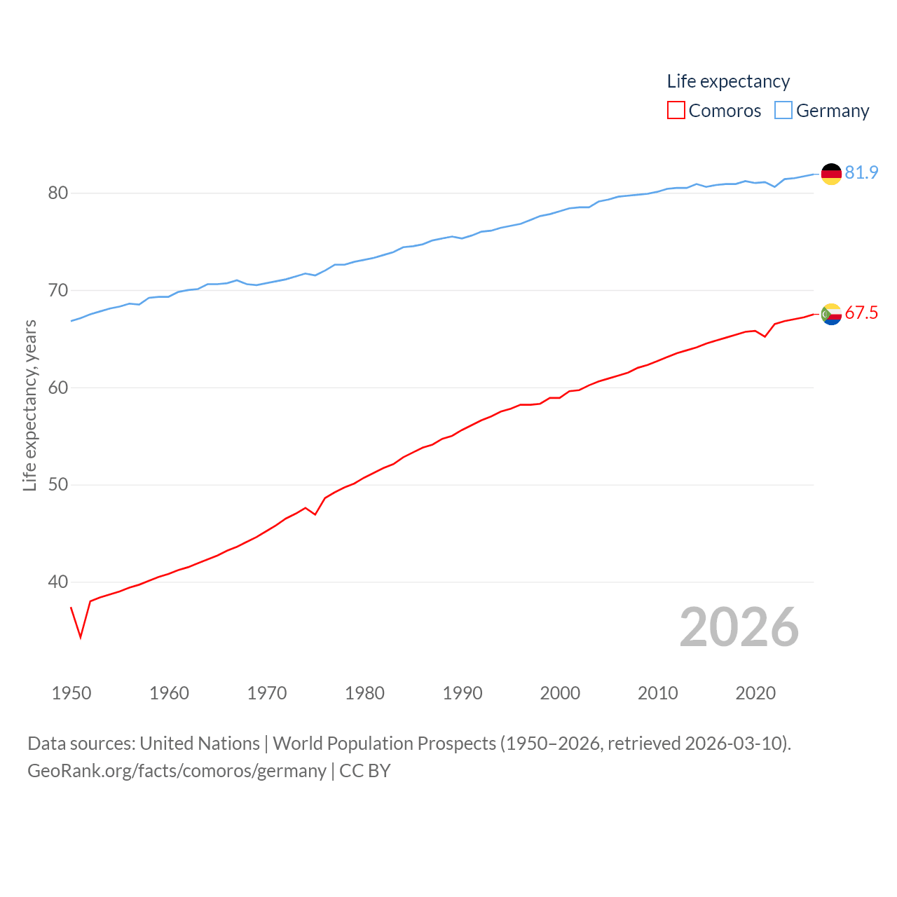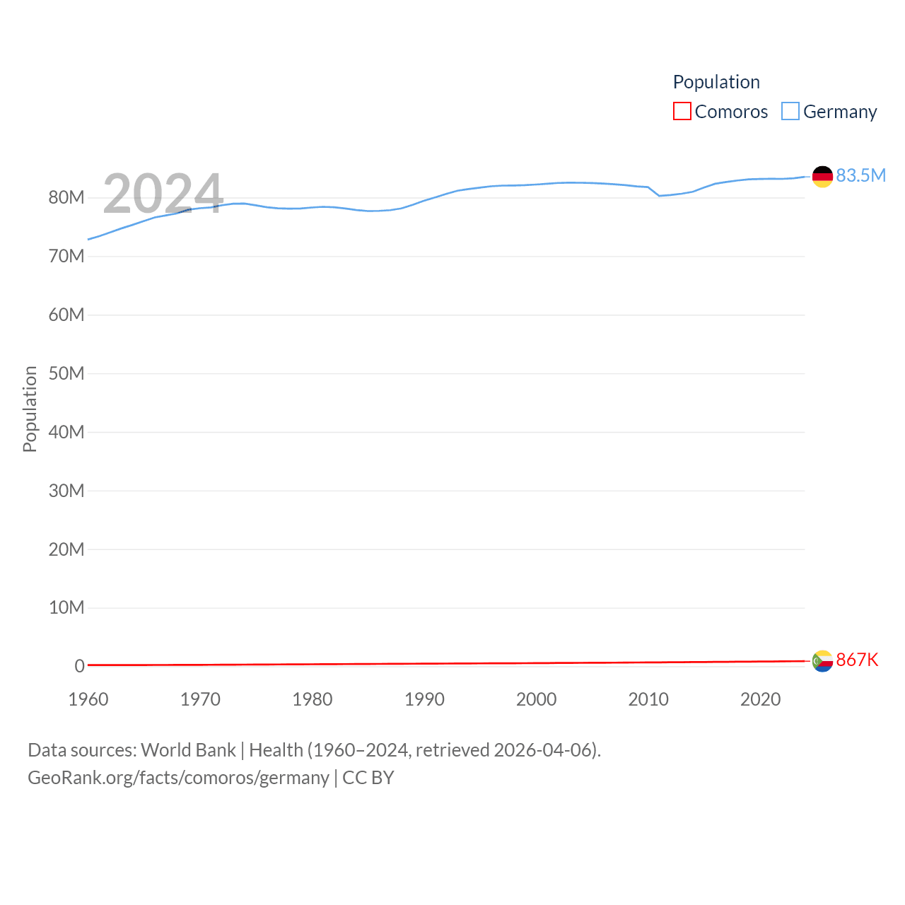 Comoros has a population of 867K (ranked 160/197), compared with 83.5M in Germany (ranked 19/197). Comoros' land area is 719 sq mi versus 134,916 sq mi for Germany (ranked 171st vs. 63rd).