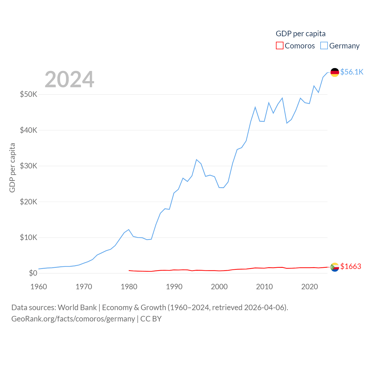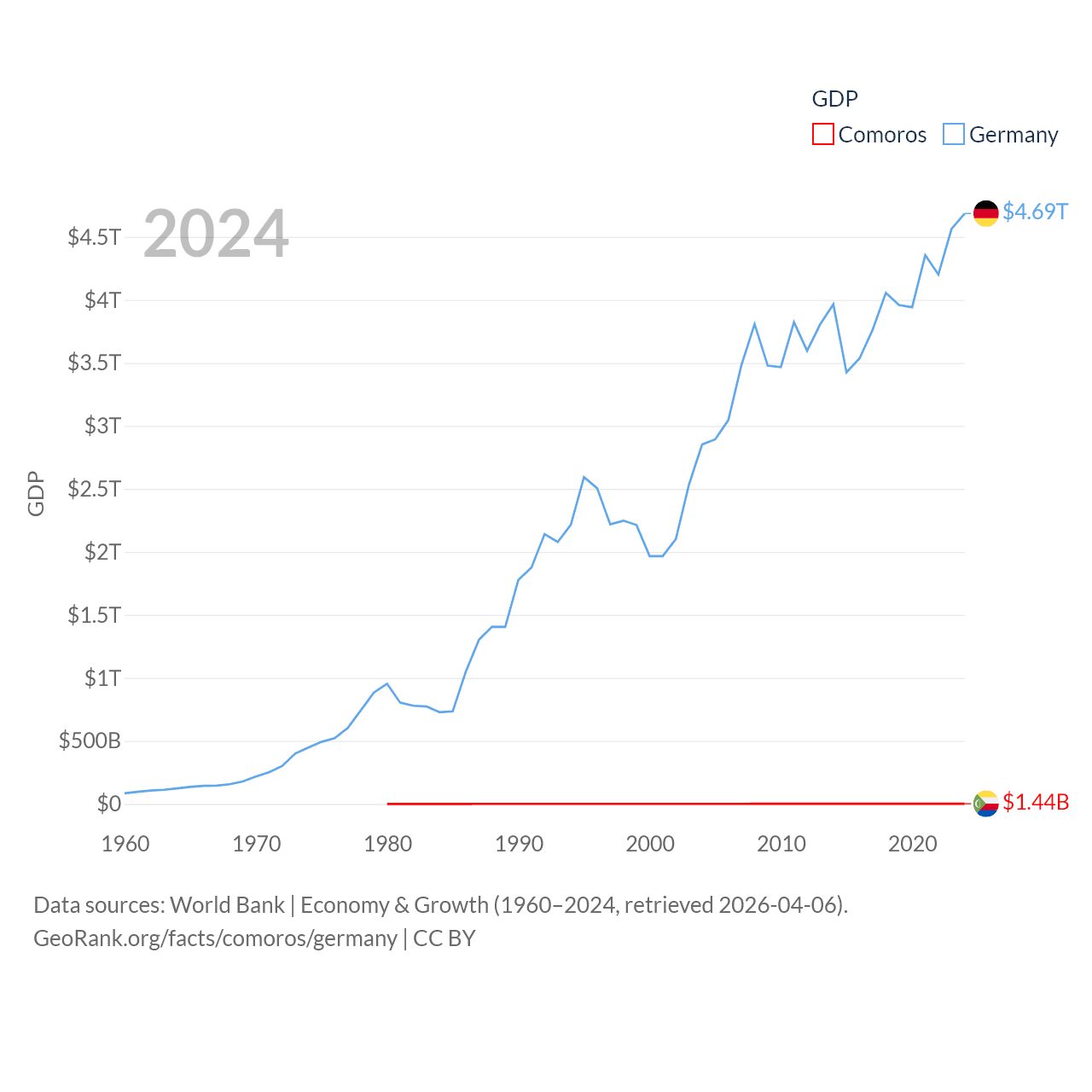 By GDP, Comoros ranks 183/197 ($1.44B) and Germany ranks 3/197 ($4.69T). By GDP per capita, Comoros ranks 161/197 ($1,663), while Germany ranks 19/197 ($56,104).