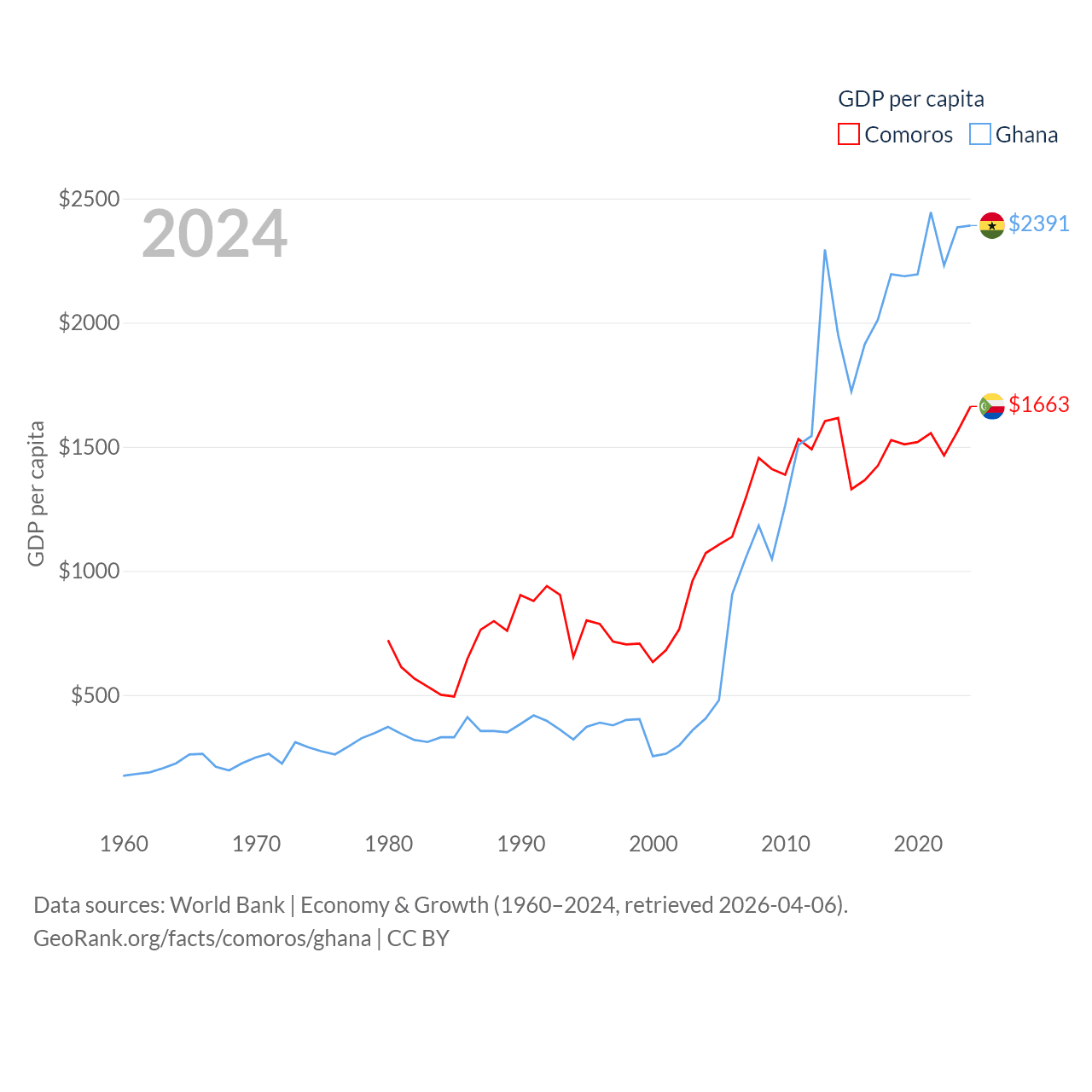 By GDP, Comoros ranks 183/197 ($1.44B) and Ghana ranks 80/197 ($82.3B). By GDP per capita, Comoros ranks 161/197 ($1,663), while Ghana ranks 151/197 ($2,391).