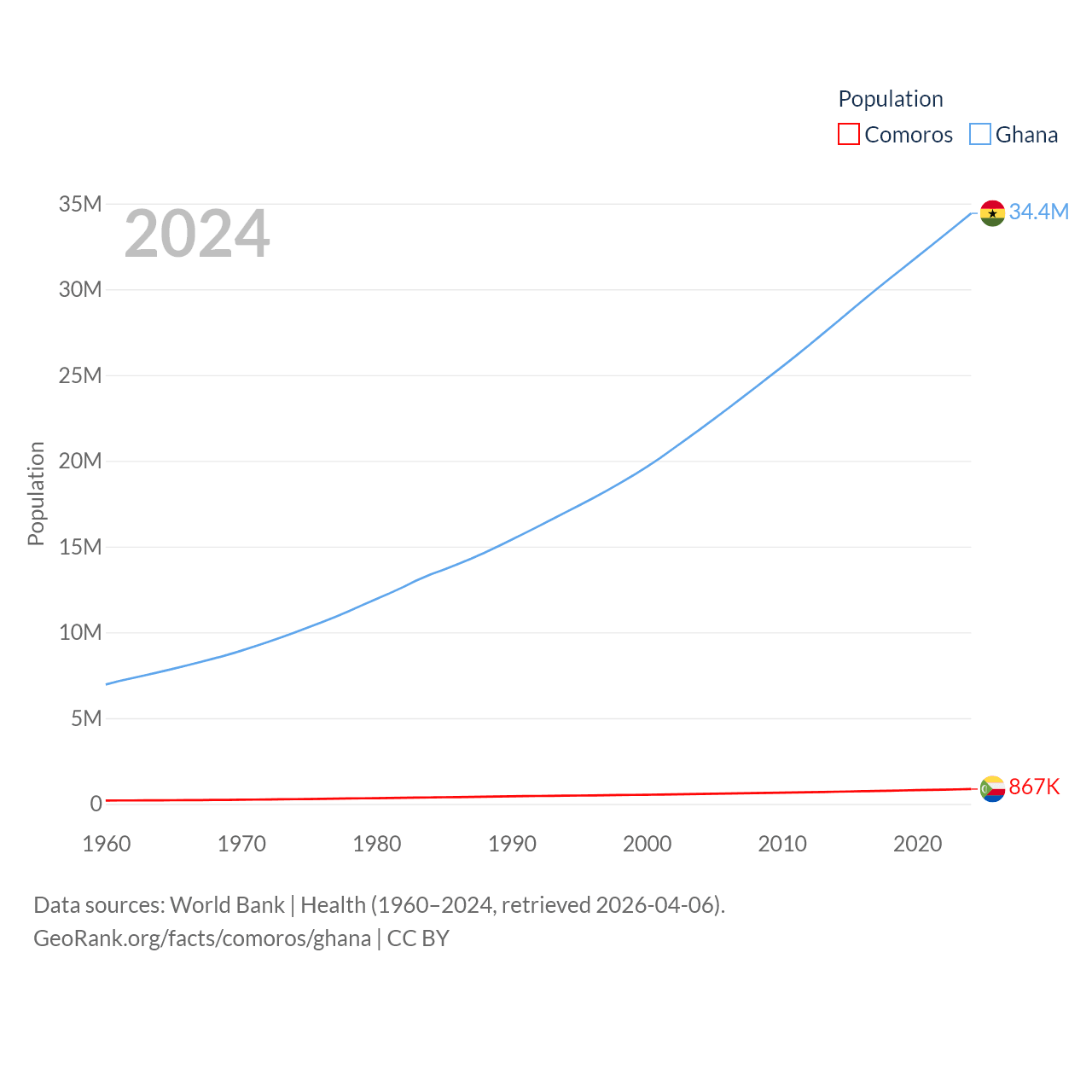 Comoros has a population of 867K (ranked 160/197), compared with 34.4M in Ghana (ranked 47/197). Comoros' land area is 719 sq mi versus 87,851 sq mi for Ghana (ranked 171st vs. 81st).