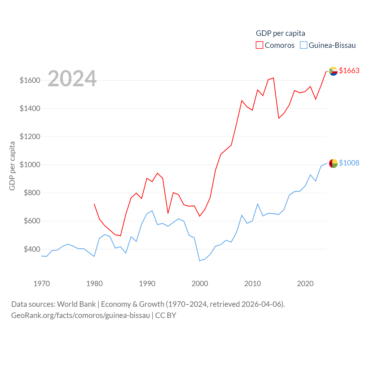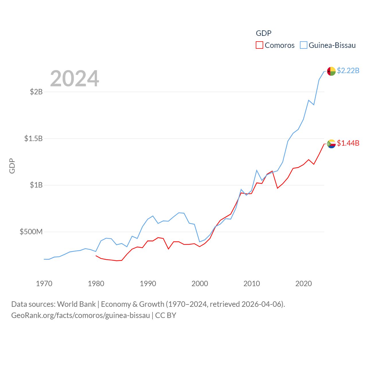 By GDP, Comoros ranks 183/197 ($1.44B) and Guinea-Bissau ranks 176/197 ($2.22B). By GDP per capita, Comoros ranks 161/197 ($1,663), while Guinea-Bissau ranks 177/197 ($1,008).
