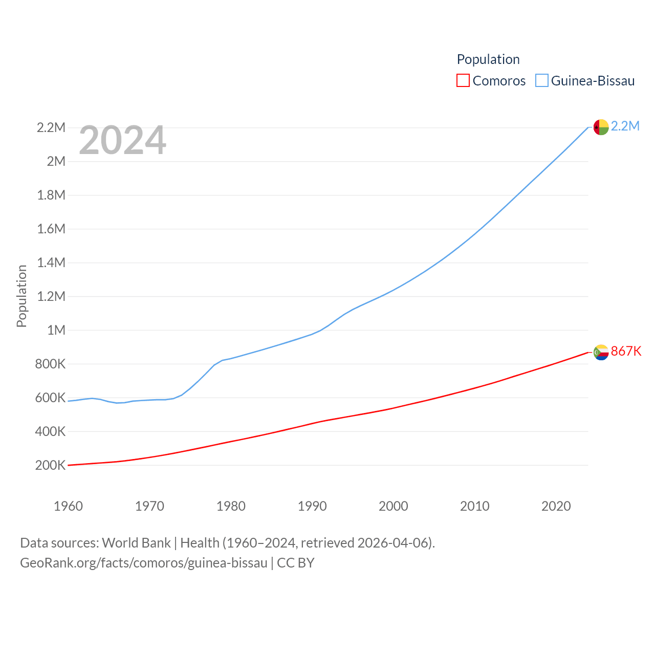 Comoros has a population of 867K (ranked 160/197), compared with 2.2M in Guinea-Bissau (ranked 146/197). Comoros' land area is 719 sq mi versus 10,857 sq mi for Guinea-Bissau (ranked 171st vs. 139th).