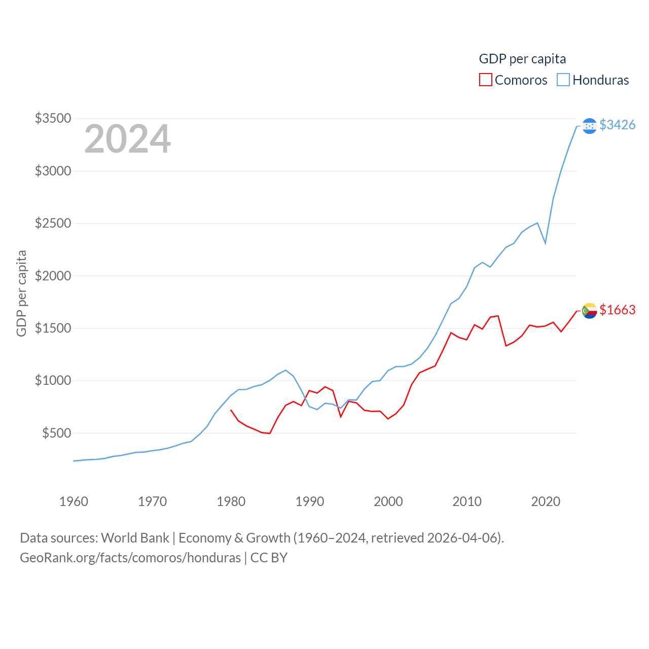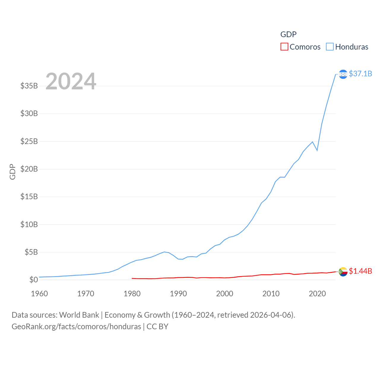 By GDP, Comoros ranks 183/197 ($1.44B) and Honduras ranks 104/197 ($37.1B). By GDP per capita, Comoros ranks 161/197 ($1,663), while Honduras ranks 136/197 ($3,426).