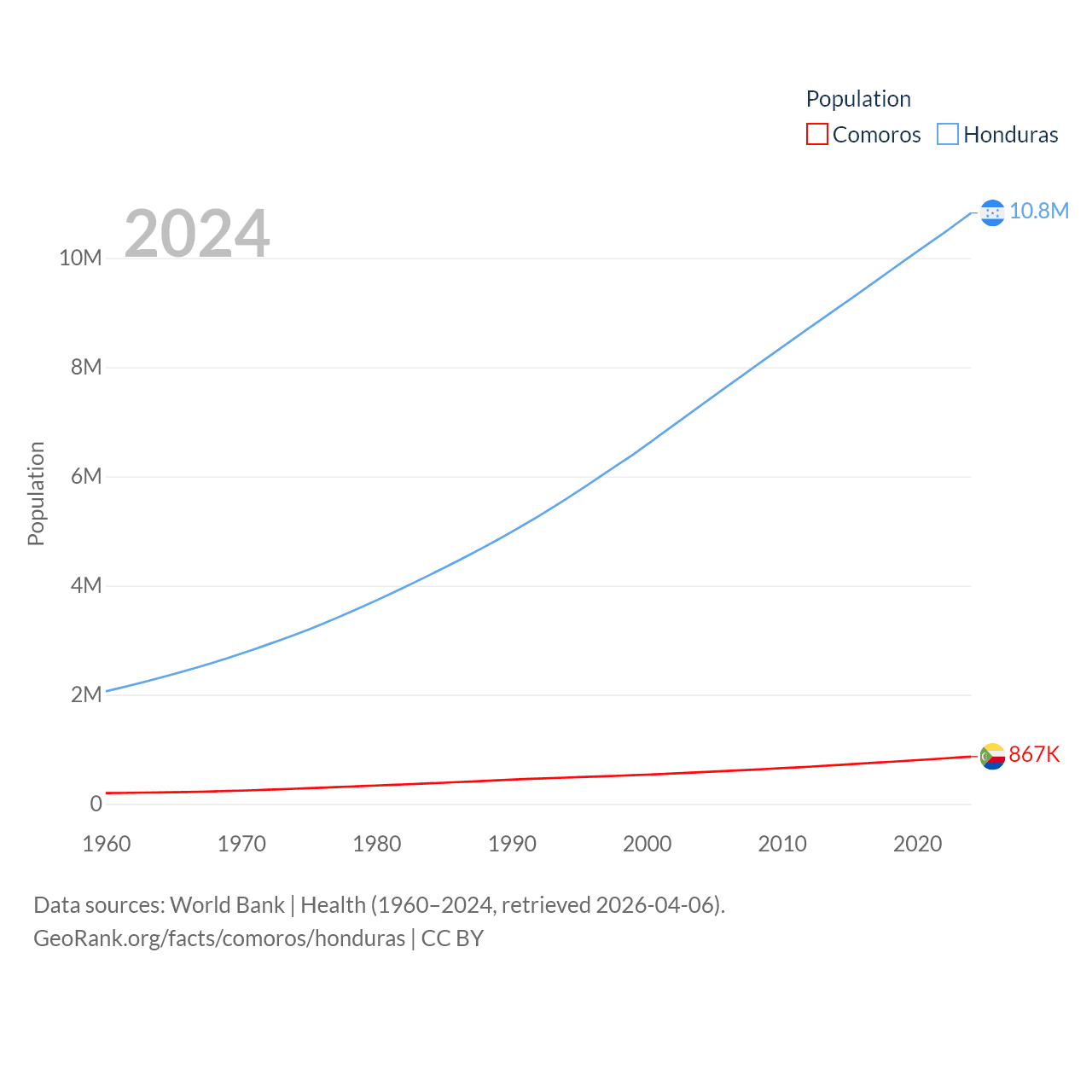 Comoros has a population of 867K (ranked 160/197), compared with 10.8M in Honduras (ranked 89/197). Comoros' land area is 719 sq mi versus 43,201 sq mi for Honduras (ranked 171st vs. 100th).