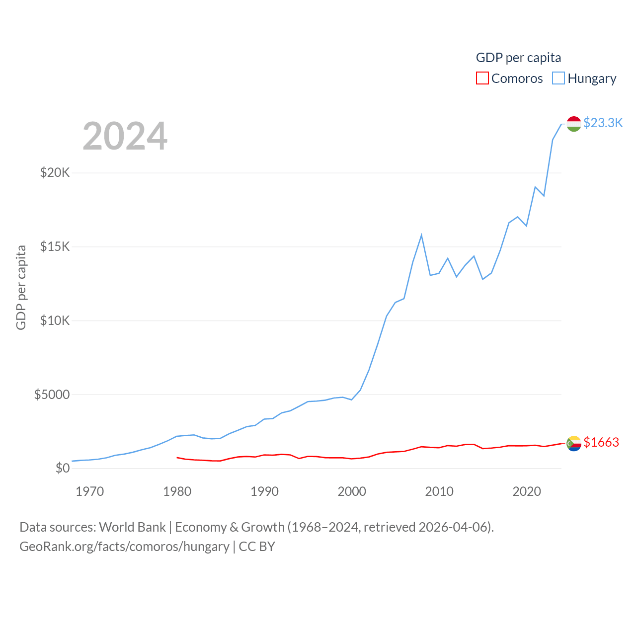 By GDP, Comoros ranks 183/197 ($1.44B) and Hungary ranks 55/197 ($223B). By GDP per capita, Comoros ranks 161/197 ($1,663), while Hungary ranks 55/197 ($23,292).