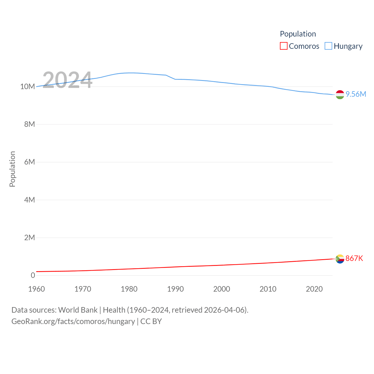 Comoros has a population of 867K (ranked 160/197), compared with 9.56M in Hungary (ranked 97/197). Comoros' land area is 719 sq mi versus 35,236 sq mi for Hungary (ranked 171st vs. 109th).