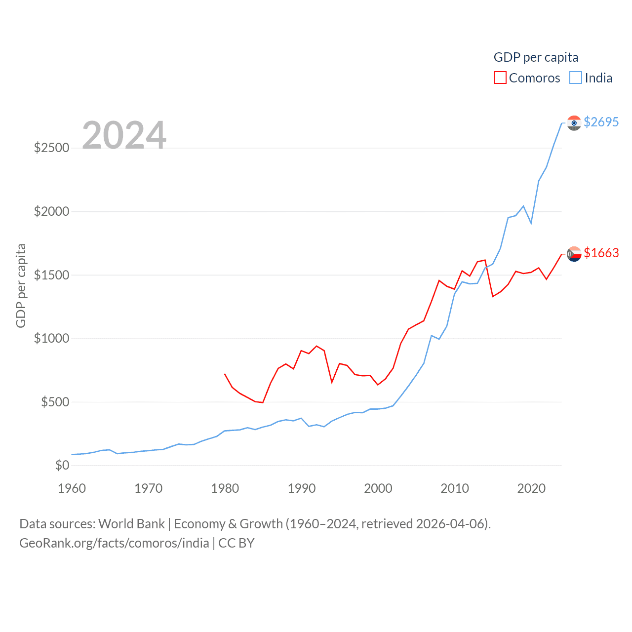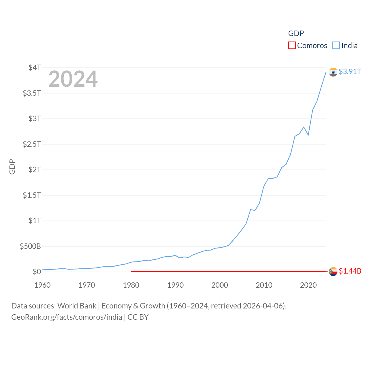 By GDP, Comoros ranks 183/197 ($1.44B) and India ranks 5/197 ($3.91T). By GDP per capita, Comoros ranks 161/197 ($1,663), while India ranks 143/197 ($2,695).