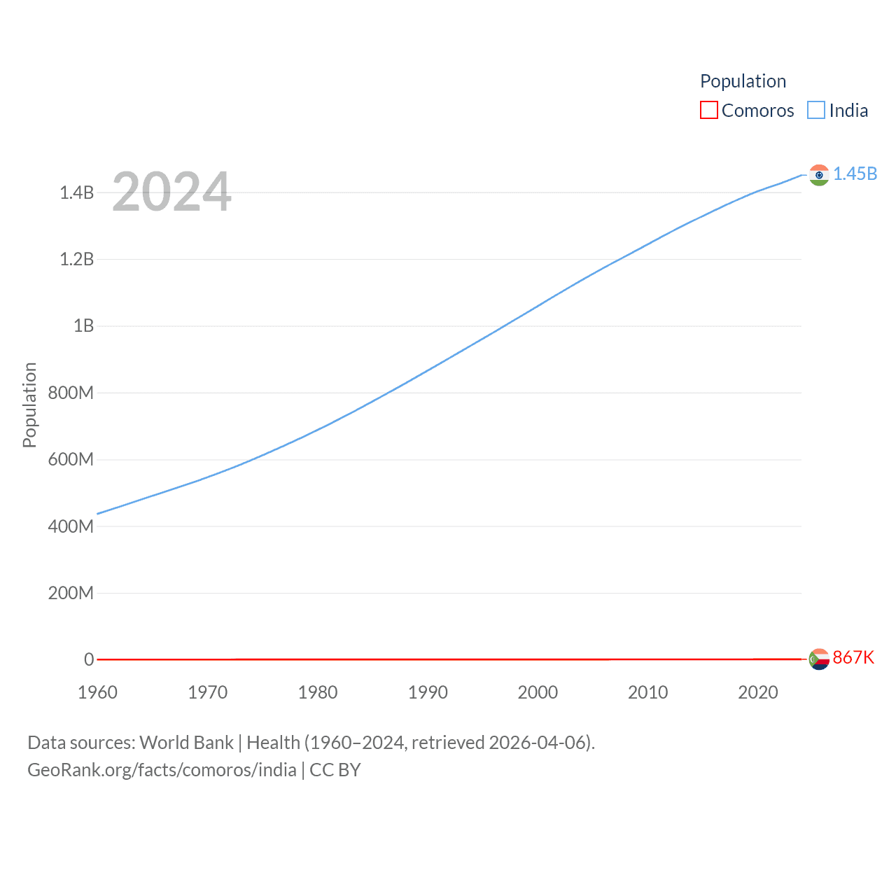 Comoros has a population of 867K (ranked 160/197), compared with 1.45B in India (ranked 1/197). Comoros' land area is 719 sq mi versus 1,147,955 sq mi for India (ranked 171st vs. 7th).