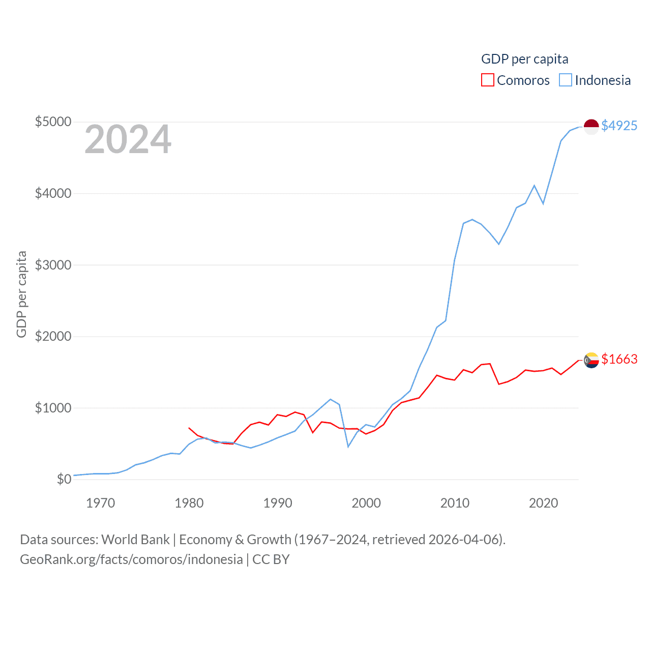 By GDP, Comoros ranks 183/197 ($1.44B) and Indonesia ranks 16/197 ($1.4T). By GDP per capita, Comoros ranks 161/197 ($1,663), while Indonesia ranks 121/197 ($4,925).