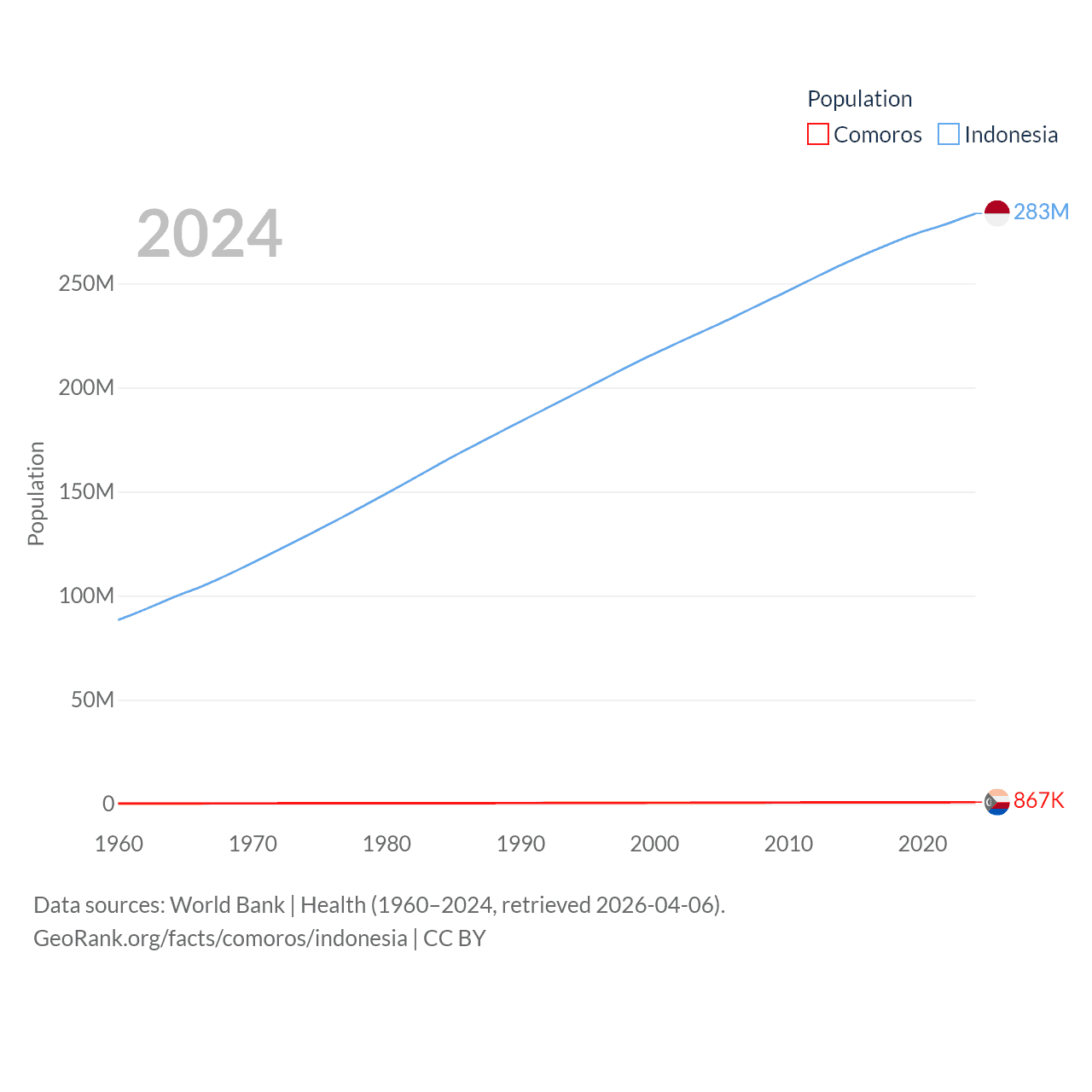 Comoros has a population of 867K (ranked 160/197), compared with 283M in Indonesia (ranked 4/197). Comoros' land area is 719 sq mi versus 730,720 sq mi for Indonesia (ranked 171st vs. 14th).