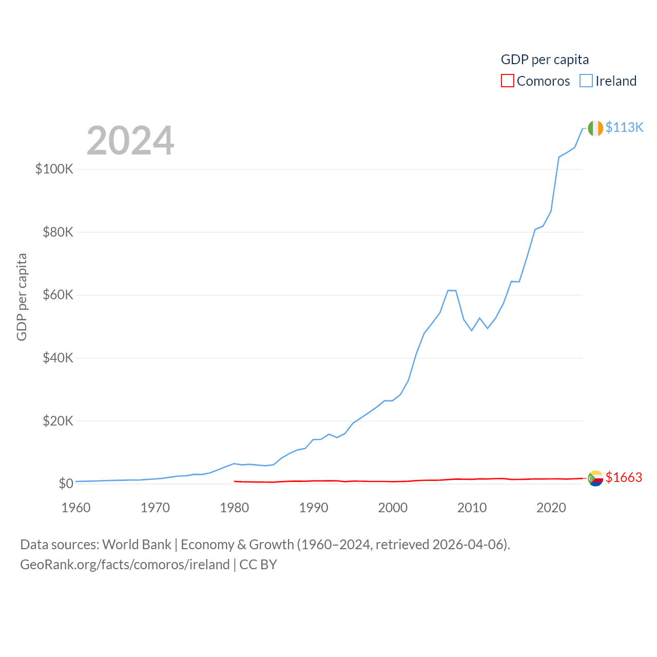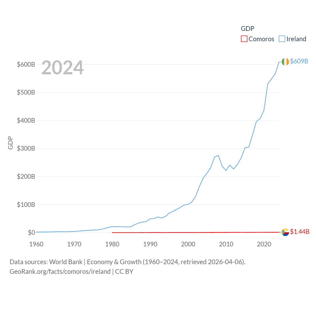 By GDP, Comoros ranks 183/197 ($1.44B) and Ireland ranks 25/197 ($609B). By GDP per capita, Comoros ranks 161/197 ($1,663), while Ireland ranks 4/197 ($112,895).