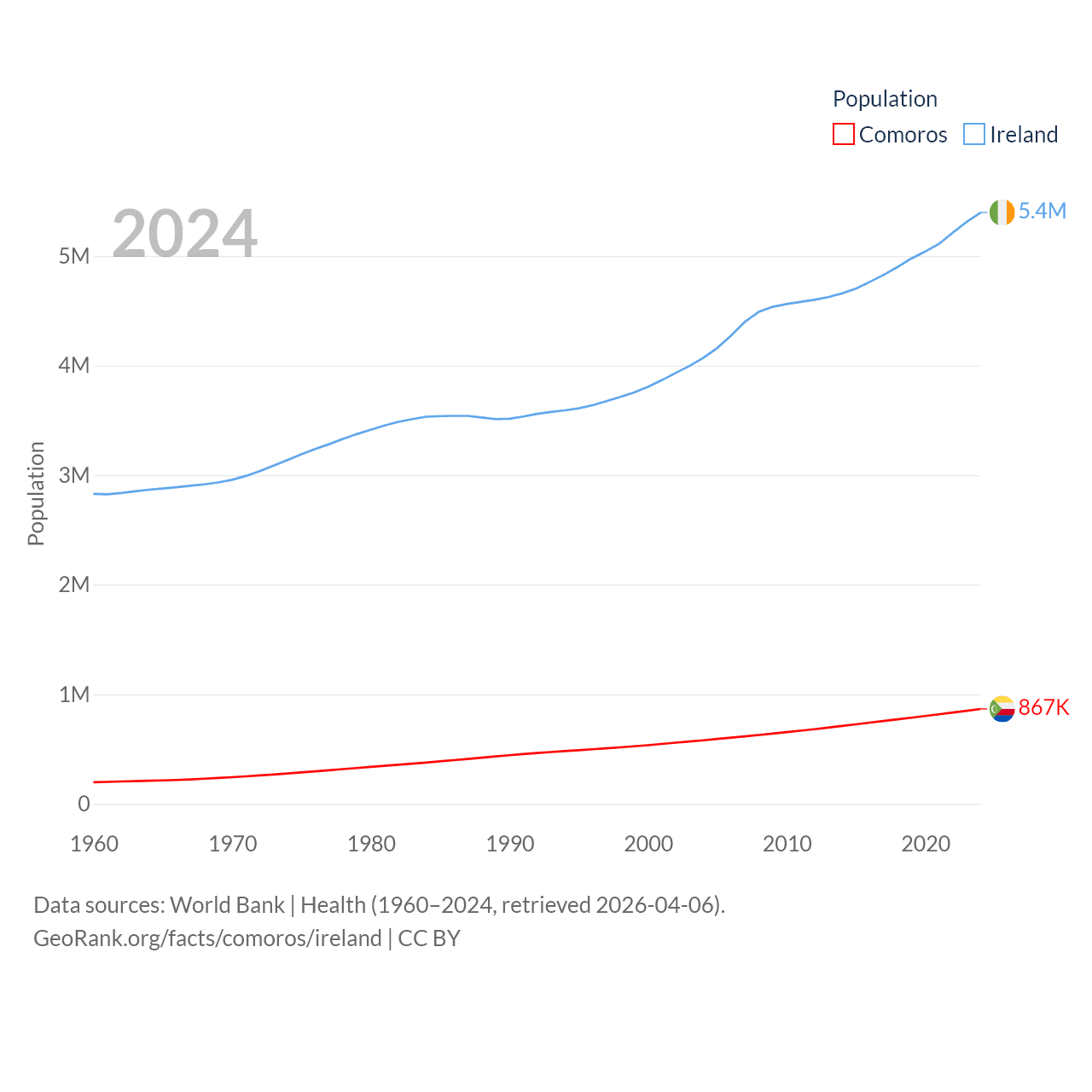 Comoros has a population of 867K (ranked 160/197), compared with 5.4M in Ireland (ranked 120/197). Comoros' land area is 719 sq mi versus 26,599 sq mi for Ireland (ranked 171st vs. 119th).