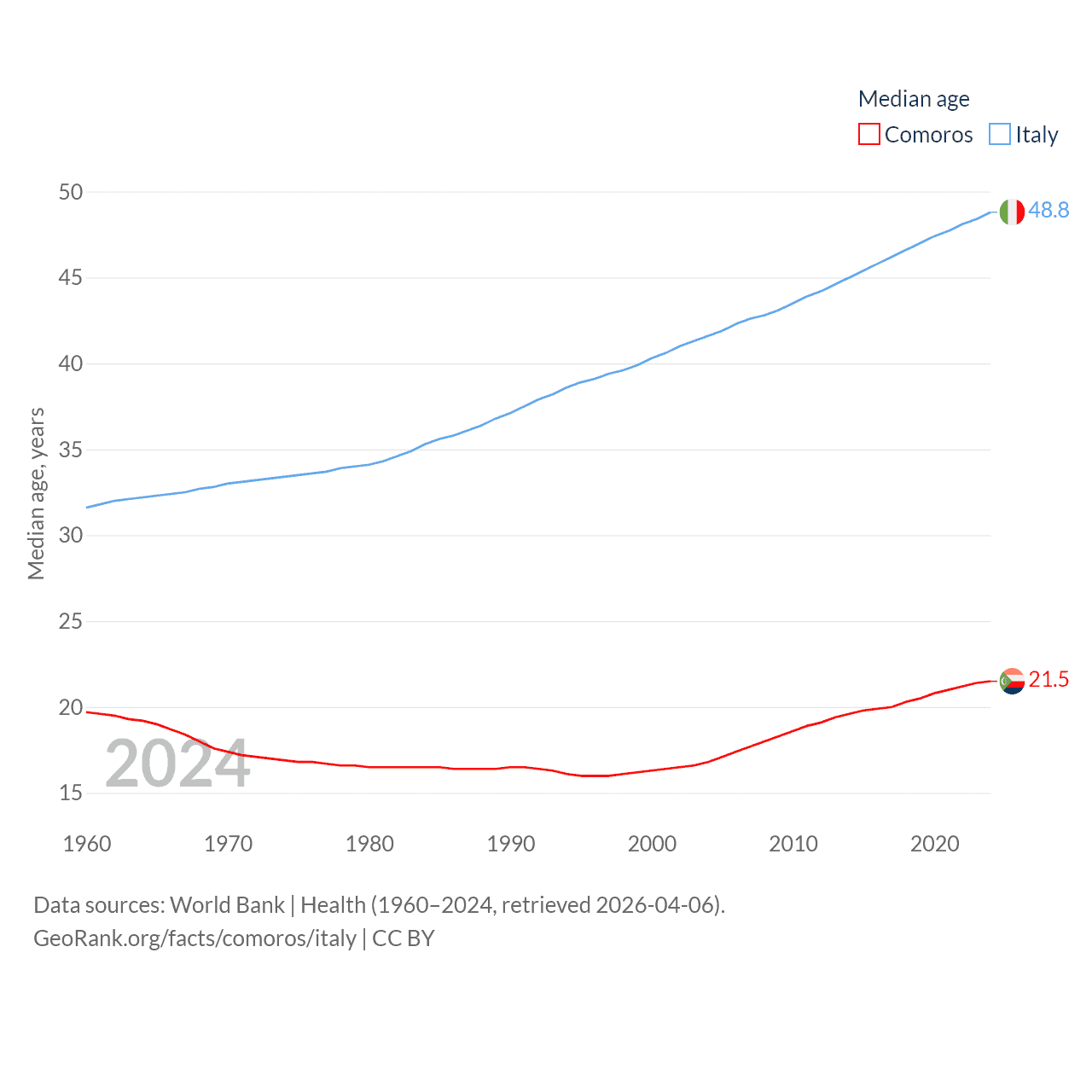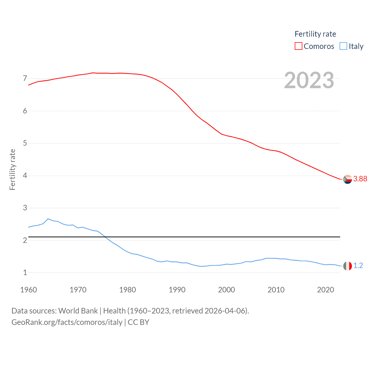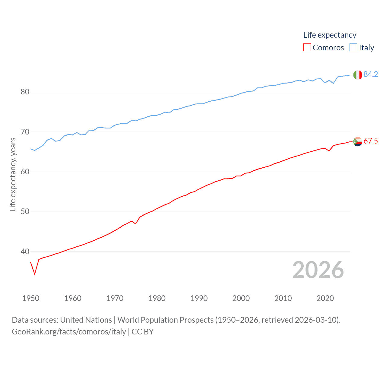 Comoros has a population of 867K (ranked 160/197), compared with 59M in Italy (ranked 25/197). Comoros' land area is 719 sq mi versus 114,178 sq mi for Italy (ranked 171st vs. 72nd).