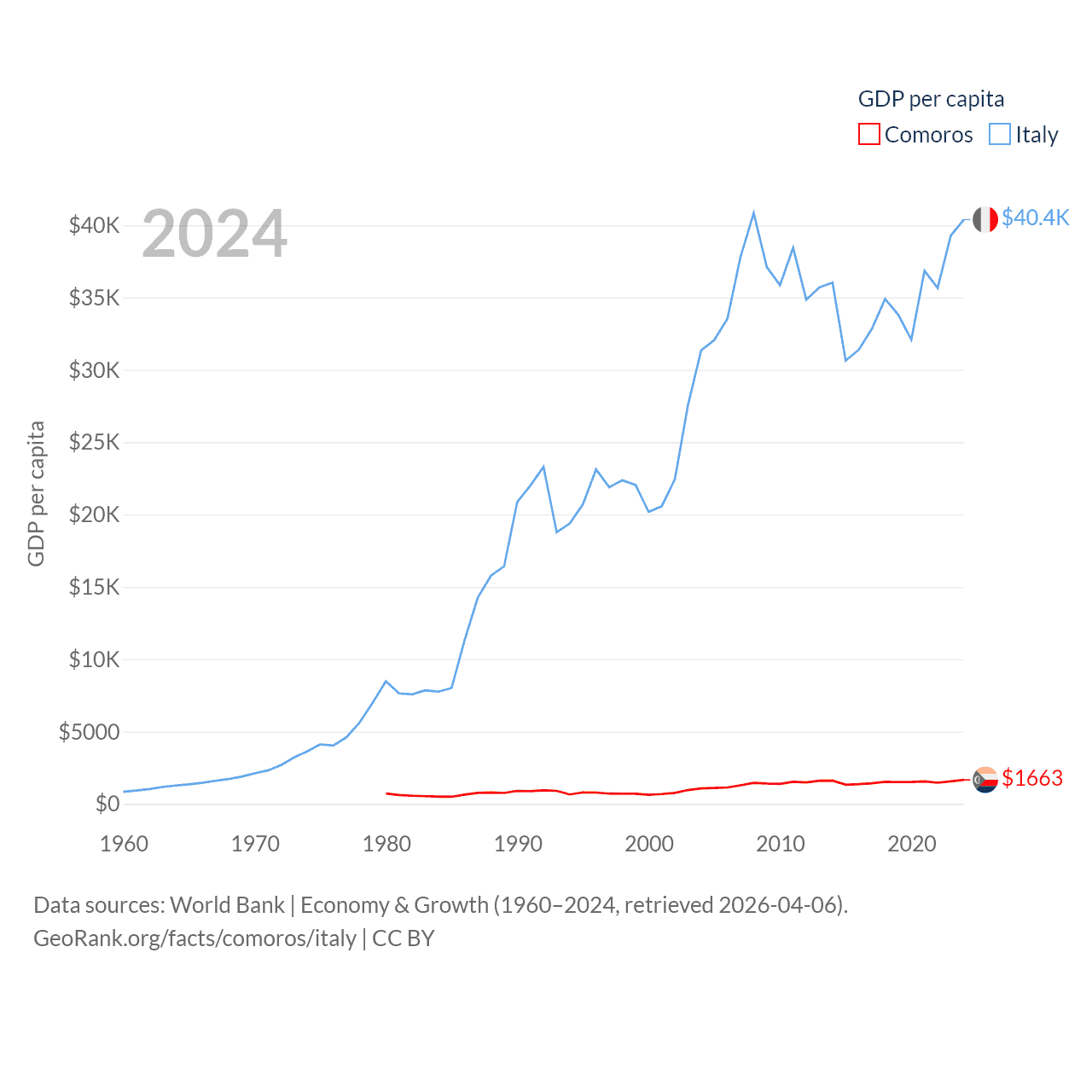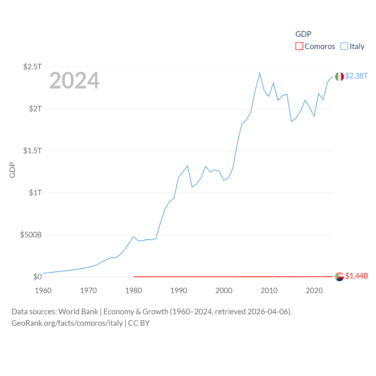 By GDP, Comoros ranks 183/197 ($1.44B) and Italy ranks 8/197 ($2.38T). By GDP per capita, Comoros ranks 161/197 ($1,663), while Italy ranks 29/197 ($40,385).