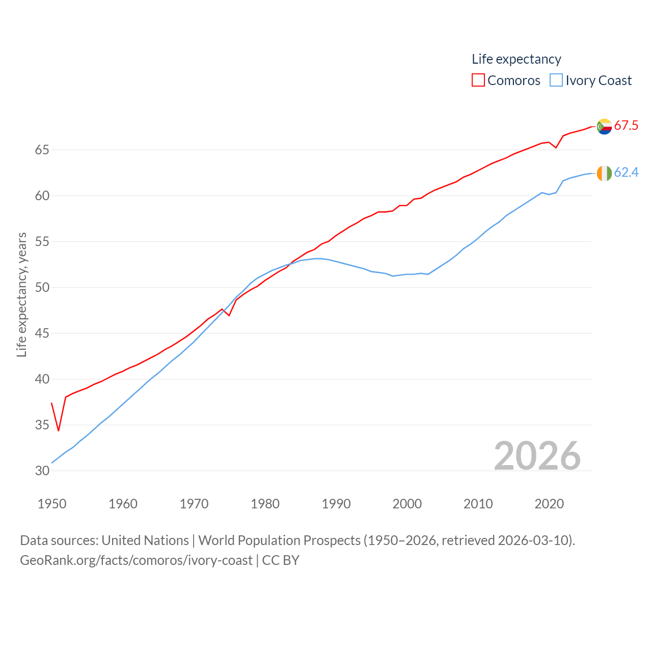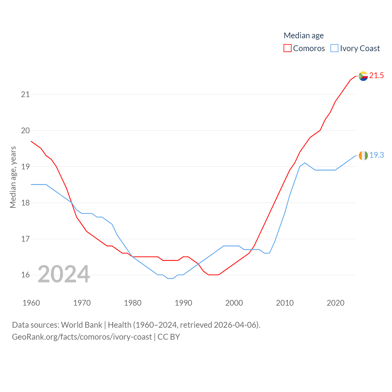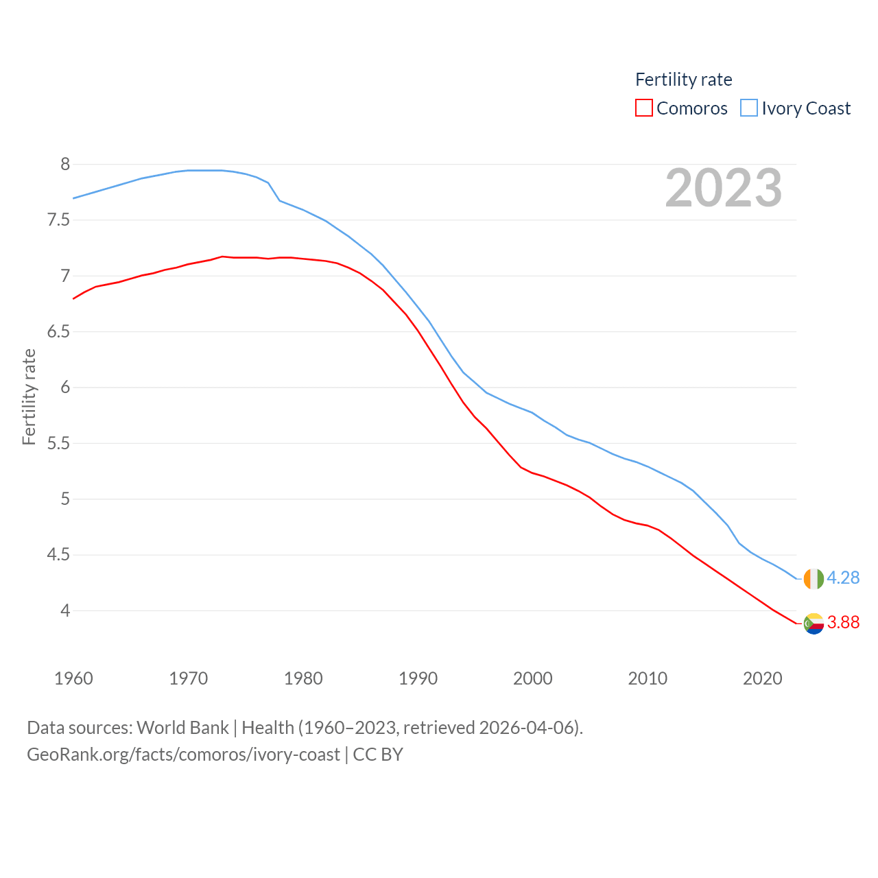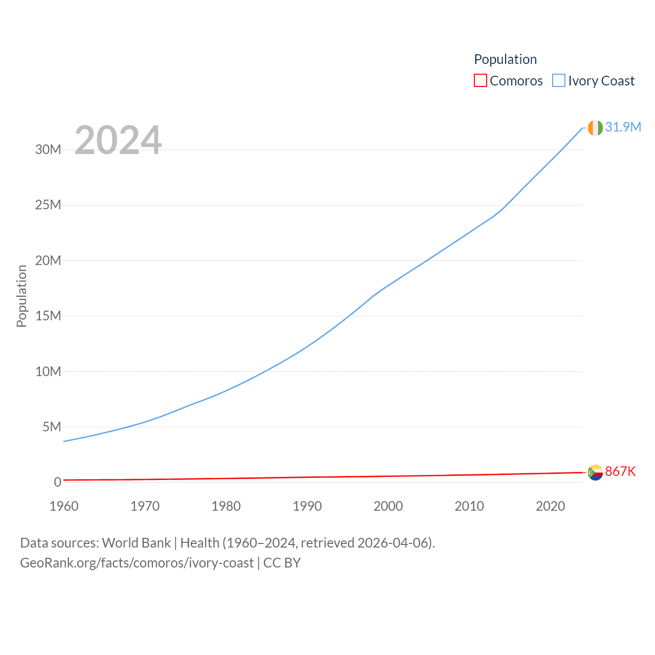 Comoros has a population of 867K (ranked 160/197), compared with 31.9M in Ivory Coast (ranked 50/197). Comoros' land area is 719 sq mi versus 122,780 sq mi for Ivory Coast (ranked 171st vs. 66th).