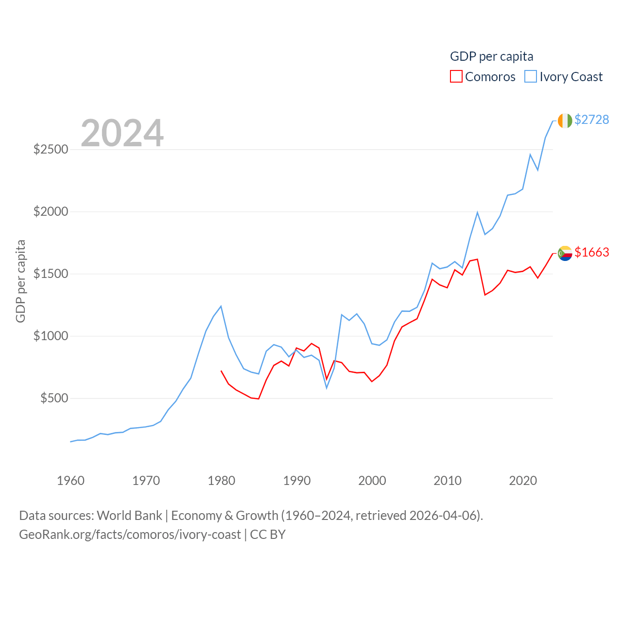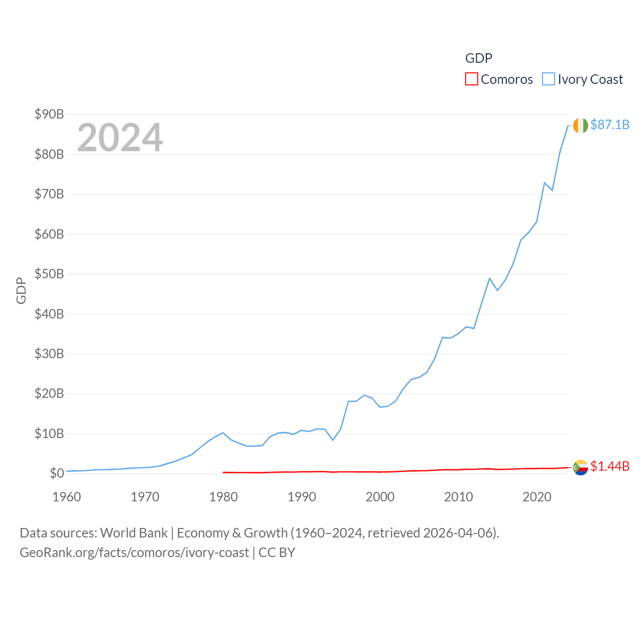 By GDP, Comoros ranks 183/197 ($1.44B) and Ivory Coast ranks 77/197 ($87.1B). By GDP per capita, Comoros ranks 161/197 ($1,663), while Ivory Coast ranks 142/197 ($2,728).